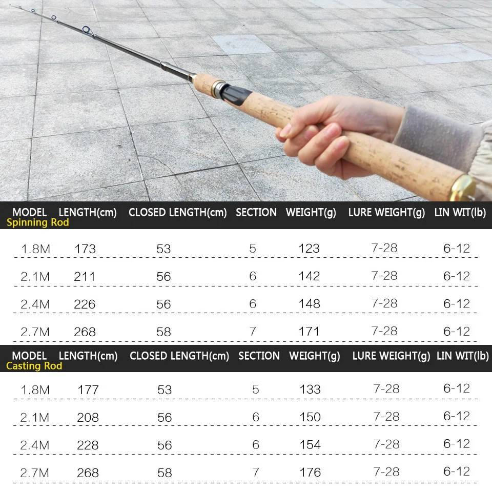 Карбоновая телескопическая удочка, спиннинг с деревянной ручкой, 1,8 м, 2,1 м, 2,4 м, 2,7 м