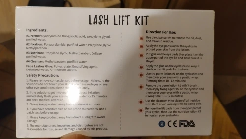 Замовляю не перший раз. Замовляла 28.11, отримала 20.12. Трек відслідковувався. Ефект ламінування тримається місяць, а далі вії хто куди. Це нормально. Користуюсь продуктом майже рік. Мені подобається. Після ламінування є припухлість повіки, яка сходить за день. У мене така реакція на клей. Дуже швидко закінчується баночка #4 (cleanser). Було б добре, якби вона була більшою і її можна було купити окремо додатково. А так все чудово. Рекомендую.