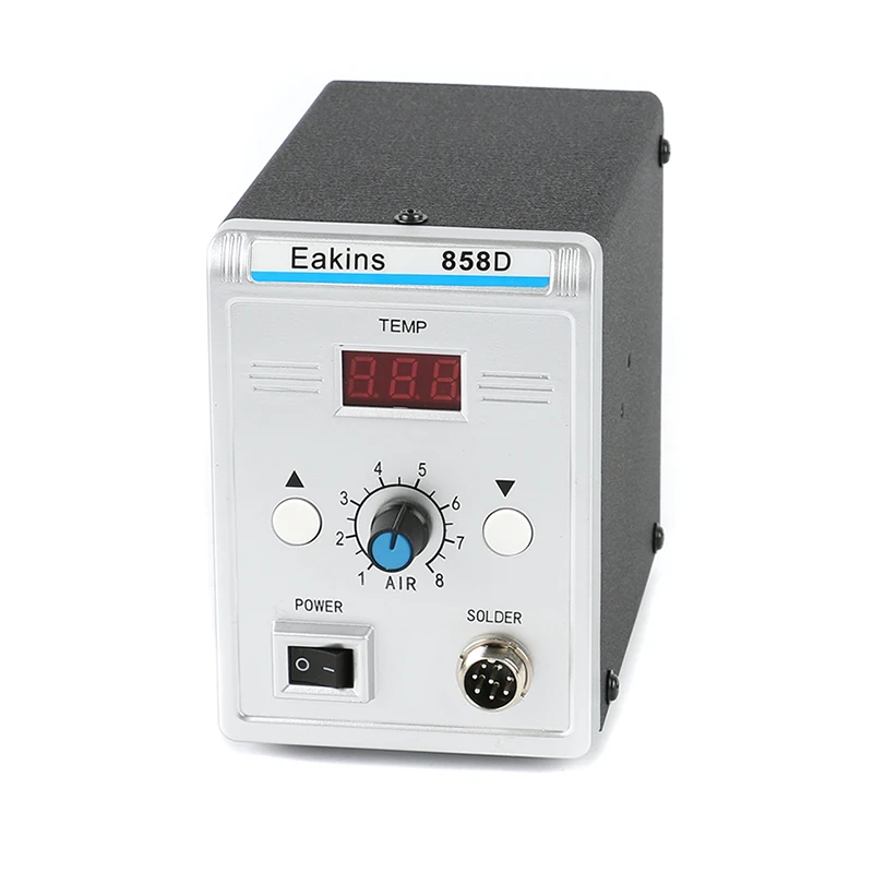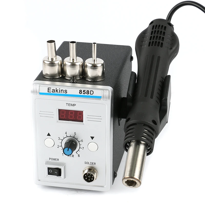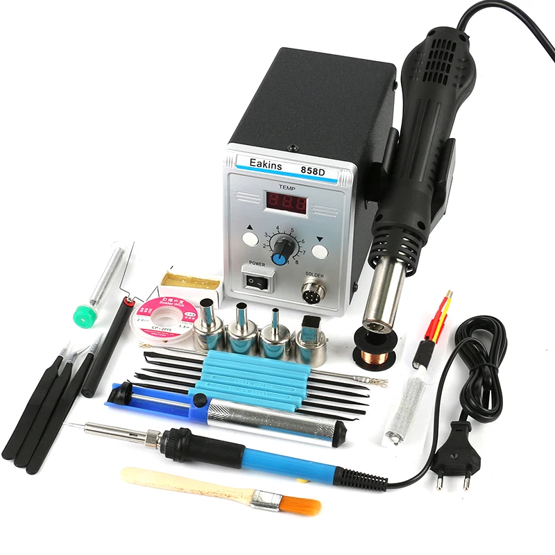 Обслуживание и использование паяльника:1. Температура железа: Это уменьшит функцию при высокой температуре, поэтому, пожалуйста, низкая температура. С сильной функцией восстановления температуры. Достаточно низкотемпературный сварной шов и защищает чувствительные к температуре компоненты.2. Очистка: чистый паяльник с чистящей губкой. После сварки, оксида железа и карбида железа Сварка повредит его, теплопроводность уменьшится. Пожалуйста, очистите оксид железа, чтобы предотвратить повреждение и низкую температуру.3, если не использовать: пожалуйста, держите более низкую температуру, когда не используете его, высокая температура генерирует оксид и уменьшает функцию теплопроводности.4, после использования: Очистите паяльник после использования, пластина олова для предотвращения окисления. Модель: 858DТип: светодиодный цифровой дисплейПотребляемая мощность: 700 ВтВыходное напряжение:(AC24V)Диапазон температур: 200 °C-500 °CПоток воздуха: 120 л/минШум:<45 дБНагревательные компоненты: металлический нагревательДлина ручки: 110 смРазмер: 153 мм (В) * 95 мм (Ш) * 130 мм (Д)Посылка включает в себя:1 х Основной блок1 x ручка для пистолета горячего воздуха1 х Руководство1 x ручка4 x сопло1 x IC экстрактор1 x Кисть1 x Соединительный провод1 x нагреватель горячего воздуха1 x фитиль для припоя1 x Оловянная проволока3 пинцета ESD1 х вакуумная Ручка1 x канифольНабор сварочных инструментов-1 шт.1 Электрический паяльник