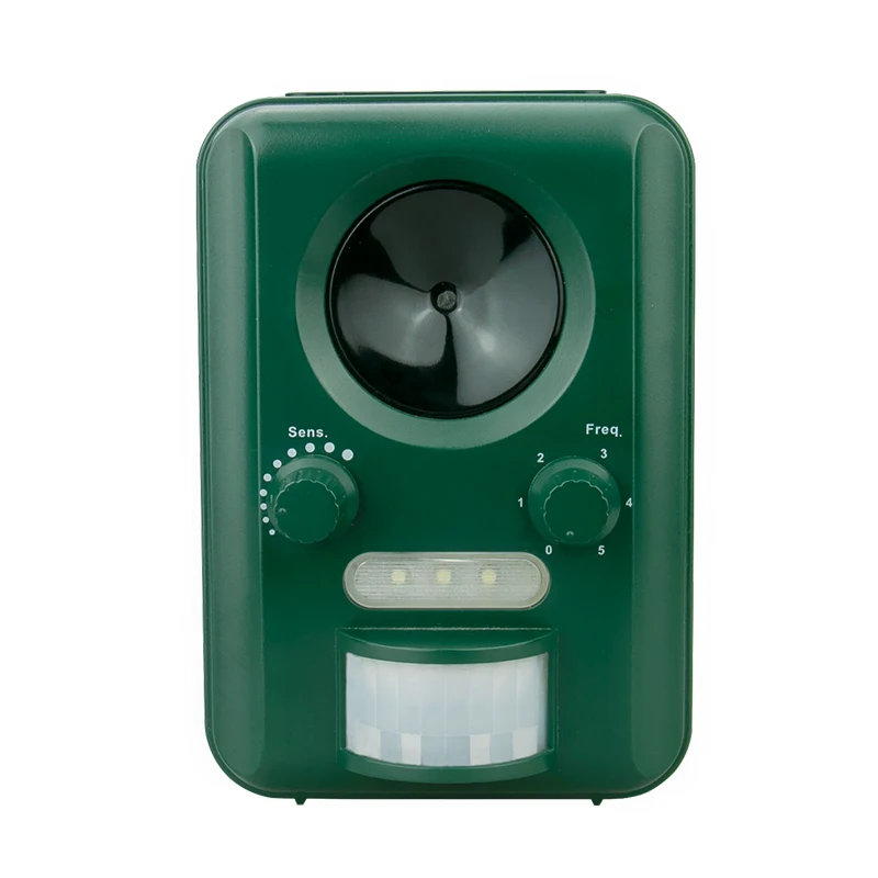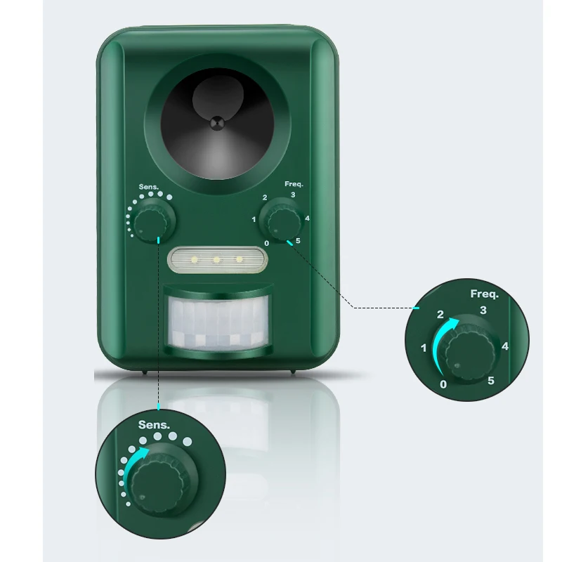 Номер патента: ZL.2012 30300821,91. Сильный ультразвуковой сигнал пугает животных. Животные избегают зоны из-за неприятного ультразвукового звука. Звук активируется, когда животное входит в зону действия. Таким образом, животные не могут привыкнуть к звуку, а отталкивающий эффект сильнее.2. Сильный мигающий испуганный зверь. Сильное мигание активируется, когда животное попадает в зону действия, тогда животные испугаются и отдаются.Положение кнопки «FREQ»:-1: 13,5 кГц-17,5 кГц отпугивает животных, таких как мыши, мелкие грызуны,...-2: 15,5 кГц-19,5 кГц отпугивает животных, таких как крупные собаки, лисы...-3: 19,5 кГц-23,5 кГц отпугивает таких животных, как маленькие собаки, кошки, птицы...-4: сильное мигание-5: все функции работают, частота развертки из режима 1-режим 2-режим 3 и включение сильного мигания