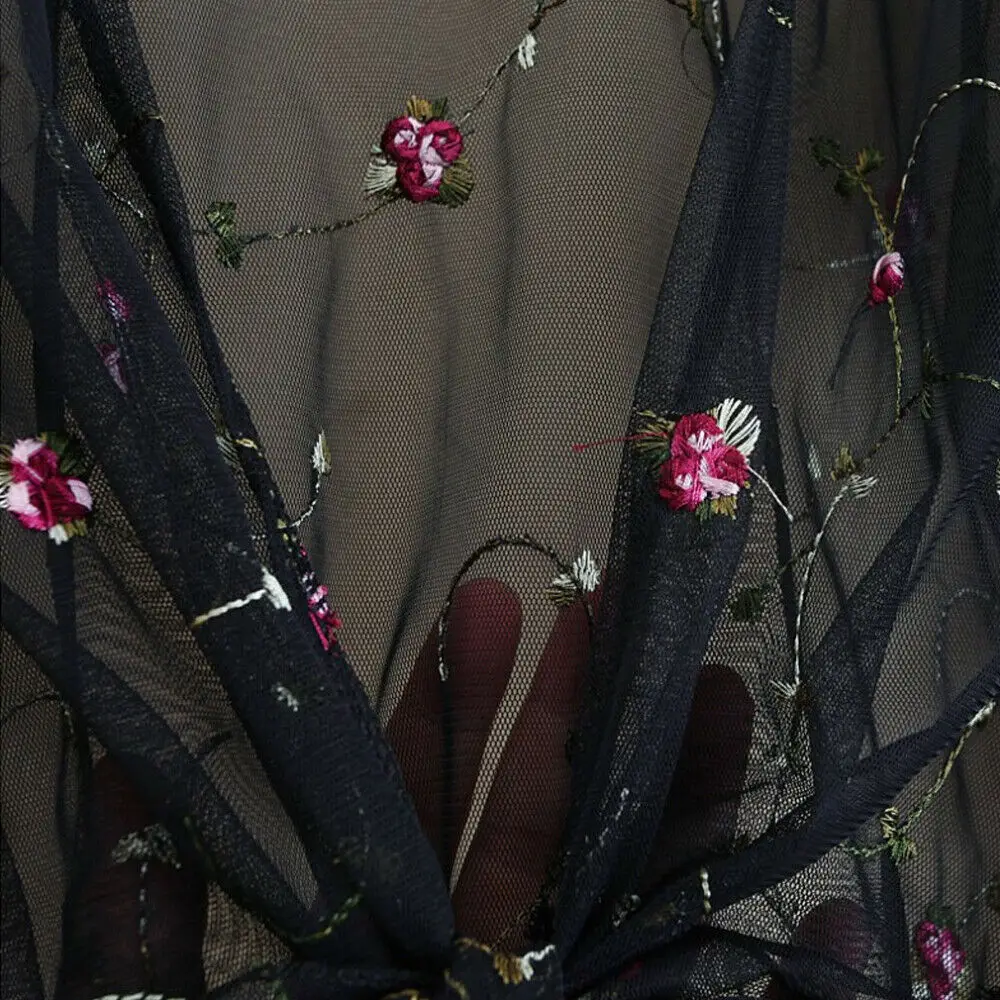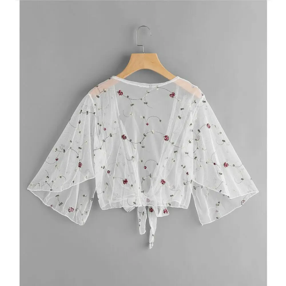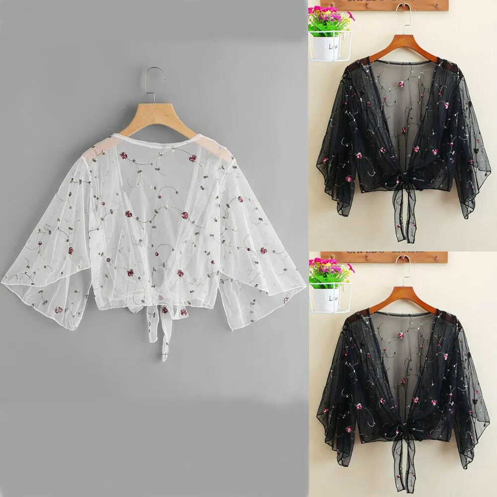 Женский сетчатый кардиган в стиле бохо, прозрачный кардиган с цветочной вышивкой и цветочным принтом, летняя блуза с длинным рукавом