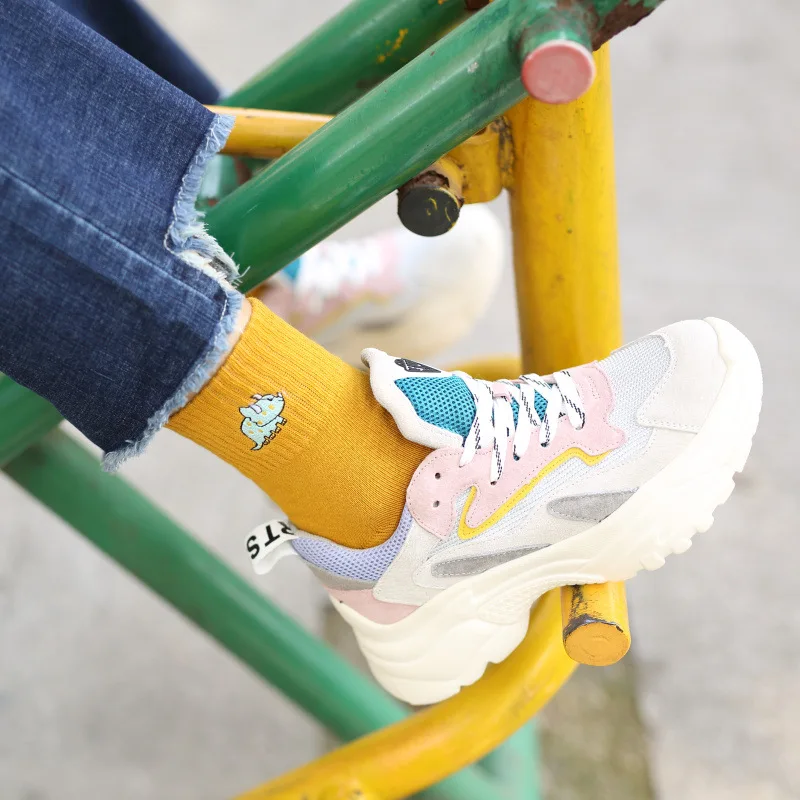 Модные Симпатичные креативные Хлопковые женские носки с вышивкой динозавра, высококачественные забавные зимние Мультяшные милые желтые носки в стиле Харадзюку