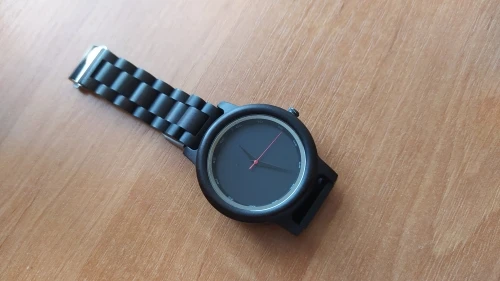 Часы соответствуют описанию. Красиво сделано. Хорошая древесина. Я получил его более месяца, часы не późni up, выглядят как новые после повседневной носки. С черными наконечниками на черном фоне Немного видны.