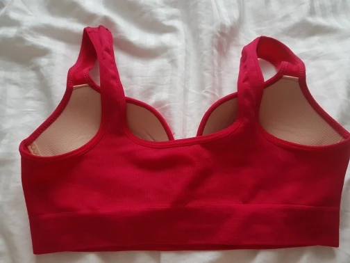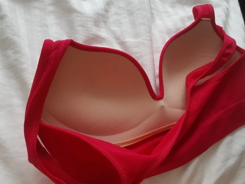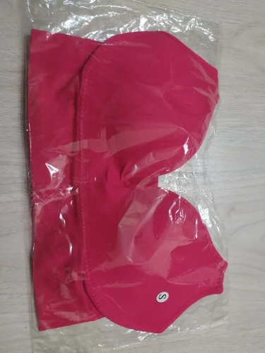 Почитав отзывы, на полную «троечку» взяла L и не прогадала. Грудь не убегает по бокам, чётко стоит (внутри твёрдая поролоновая вставка). Что мне НЕ понравилось- это внешние швы на наружной стороне плеч. Их видно и ощущение, что надела наизнанку. Цвет скорее тёмная фуксия. Приложила вещи красного цвета для сравнения. After reading the reviews, I took L for a full C size and was right. The chest doesn’t run away at the sides, it stands straight (inside there is a solid foam cup). What I didn’t like was the outer seams on the outside of the shoulders. You can see them and the feeling that you wore bra inside out. The color is rather dark fuchsia. Attached red clothes for comparison.