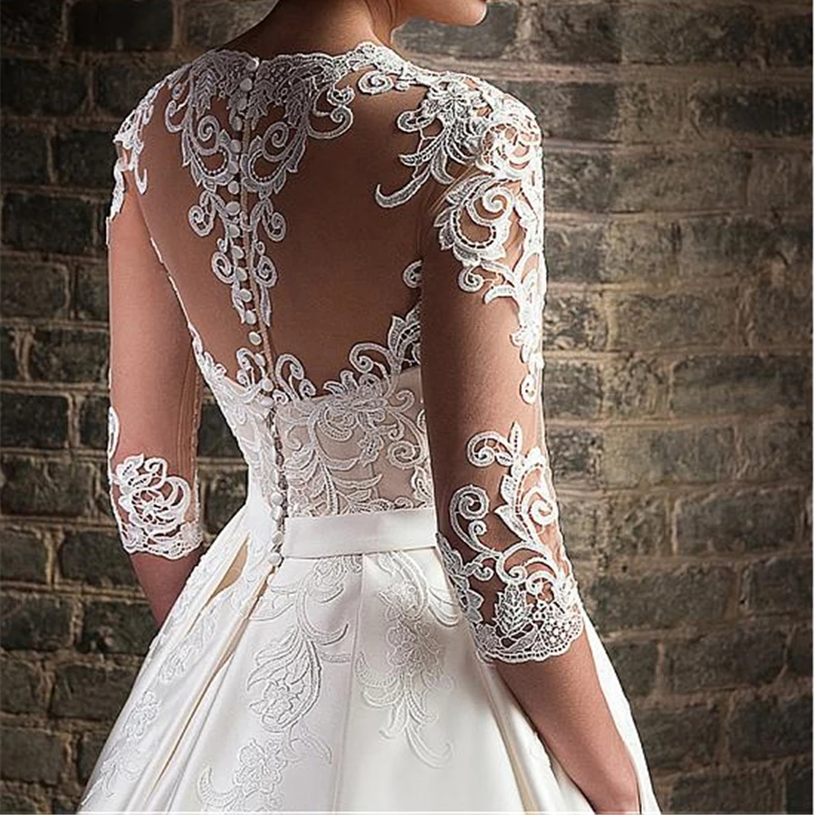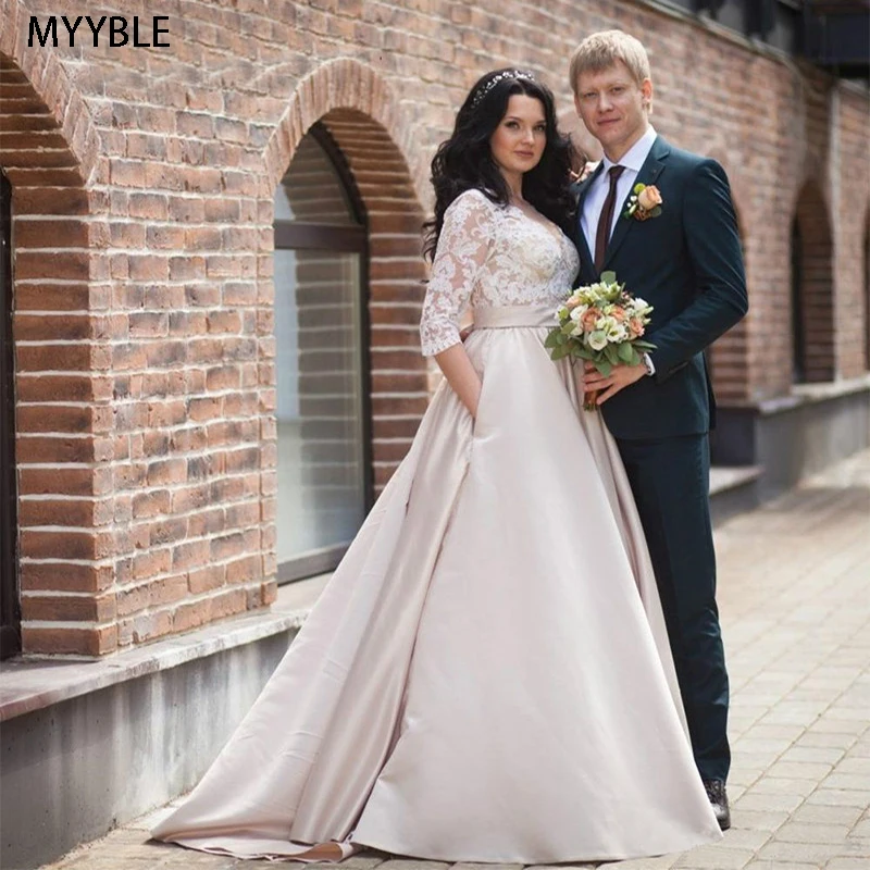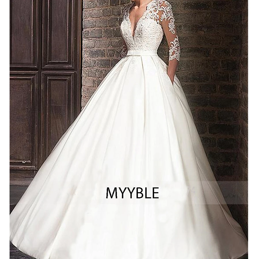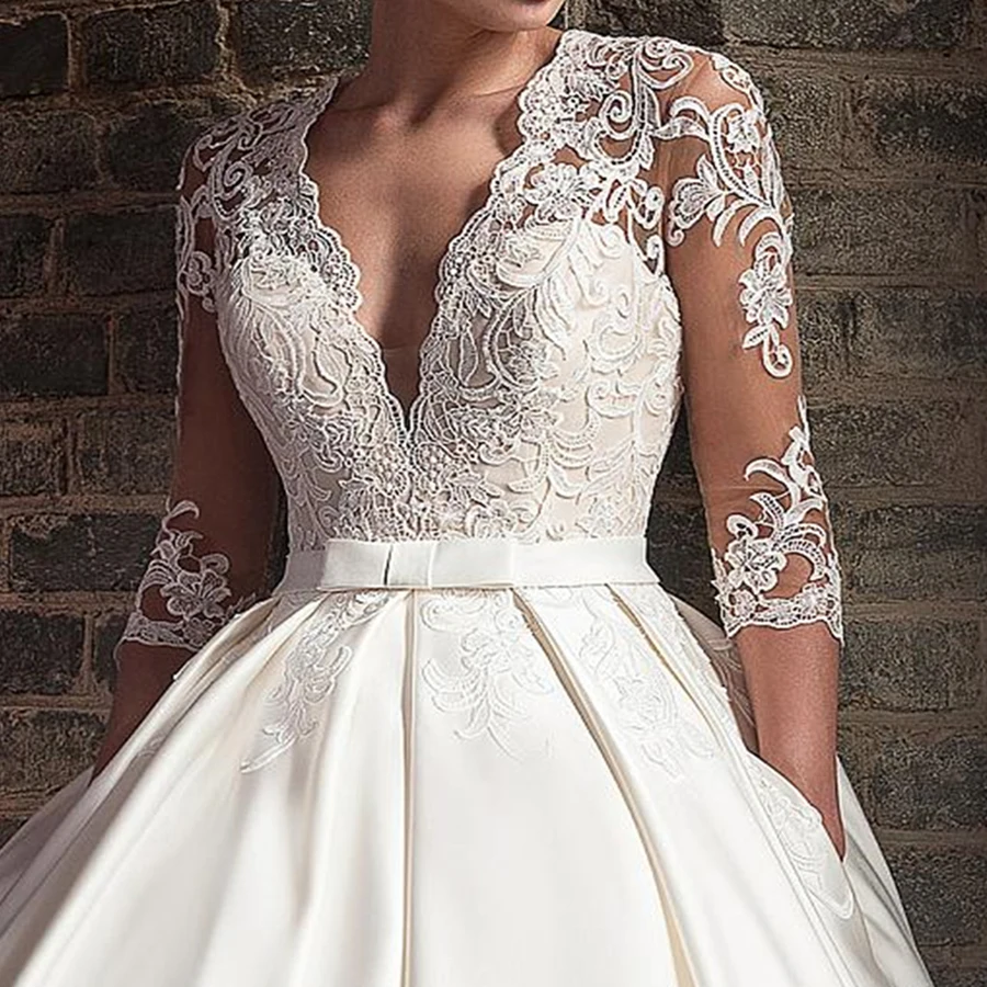 Женское атласное свадебное платье с V-образным вырезом, ТРАПЕЦИЕВИДНОЕ свадебное платье с кружевом, женское платье с карманами