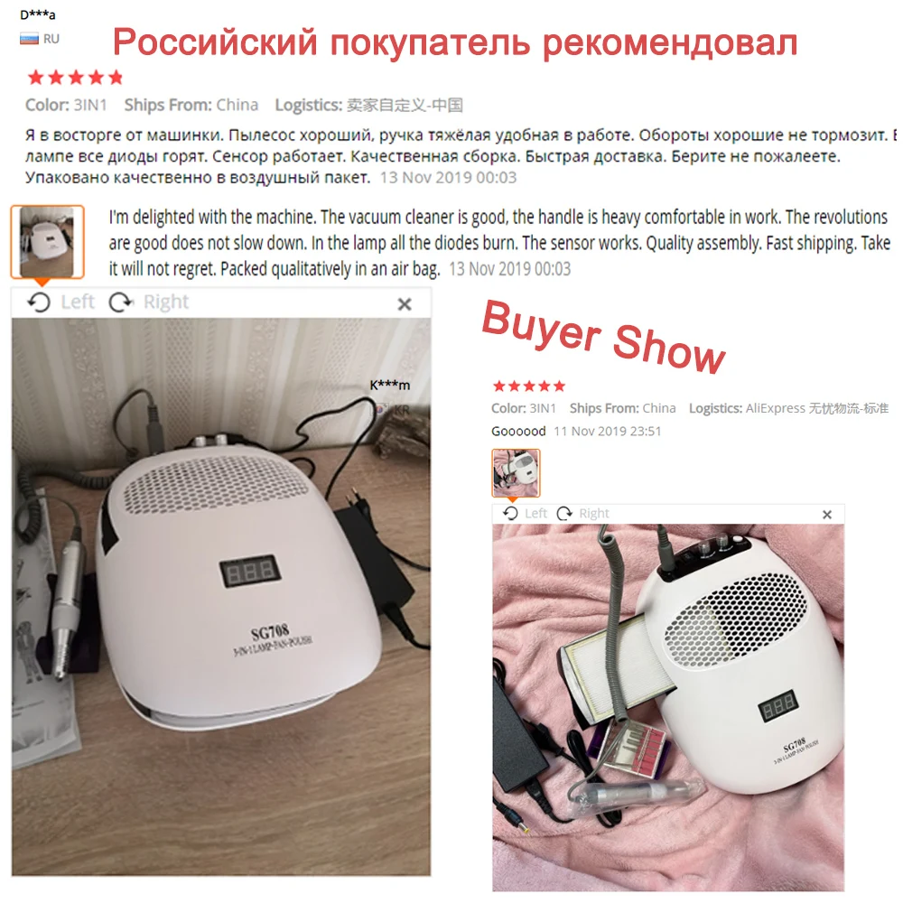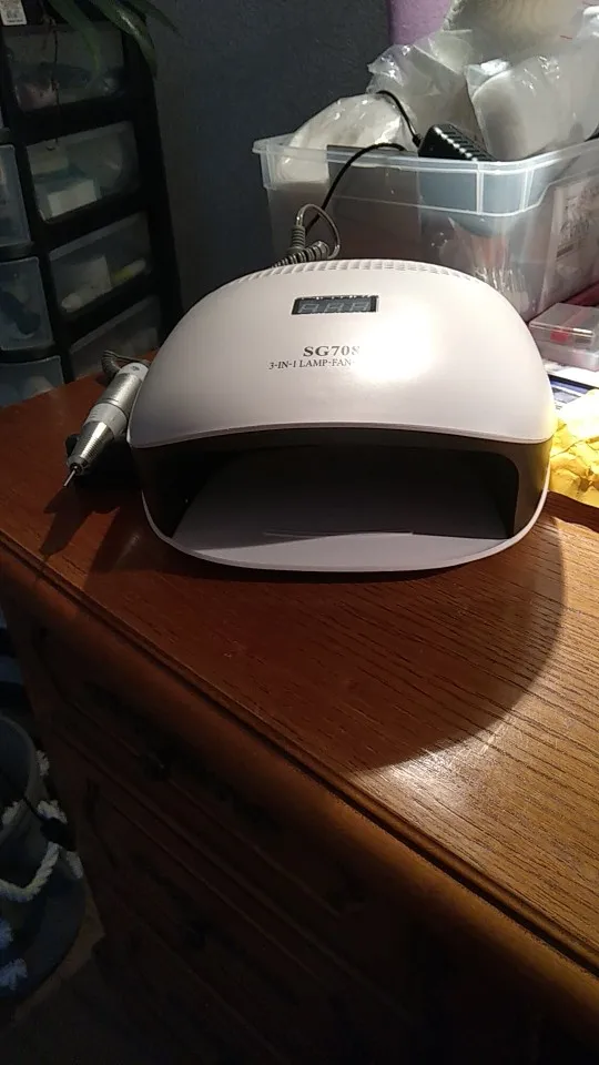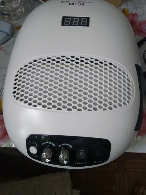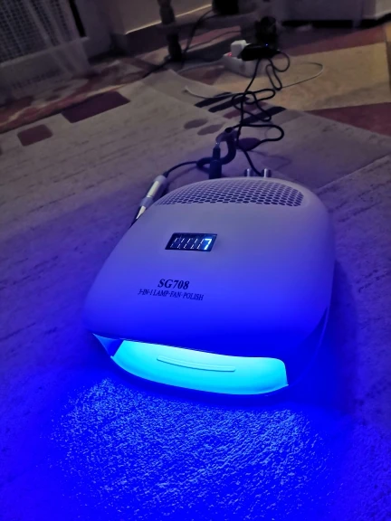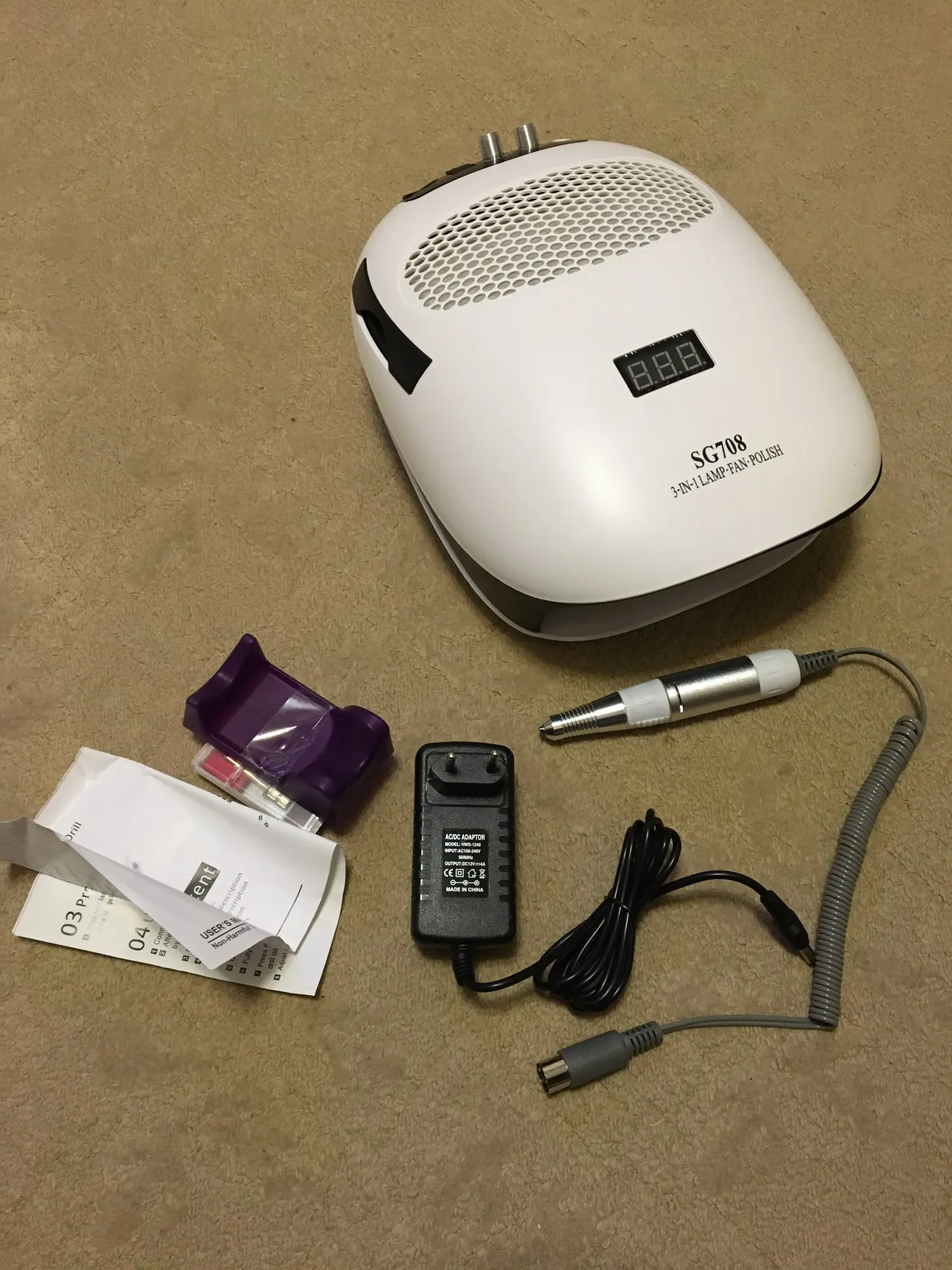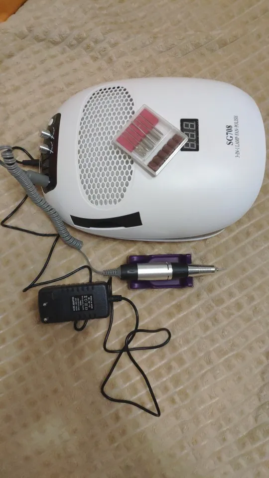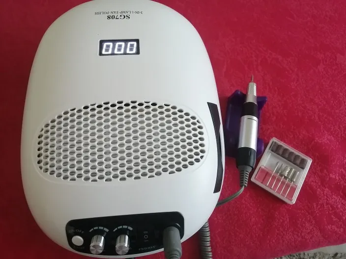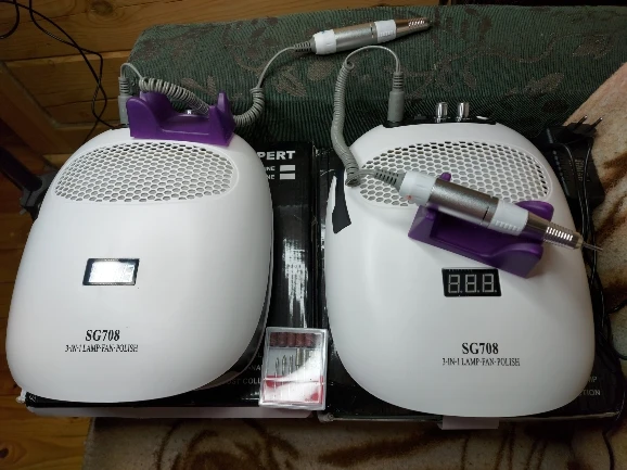 Моя первая машина для маникюра. Не с чем сравнивать, но очень довольна. Уже попробовала. Сушит гель-лак хорошо. Ручка для фрез достойная. Во время работы не дрибежжит. Фрезы, которые идут в комплекте тоже приличные. Но я заказала отдельно (то получше). На мое удивление тихая. Не очень громко жужжит. Я очень рада. Мне нравиться. Заказала 11.11. а прошло 20-го январе. Но я всё равно довольна.