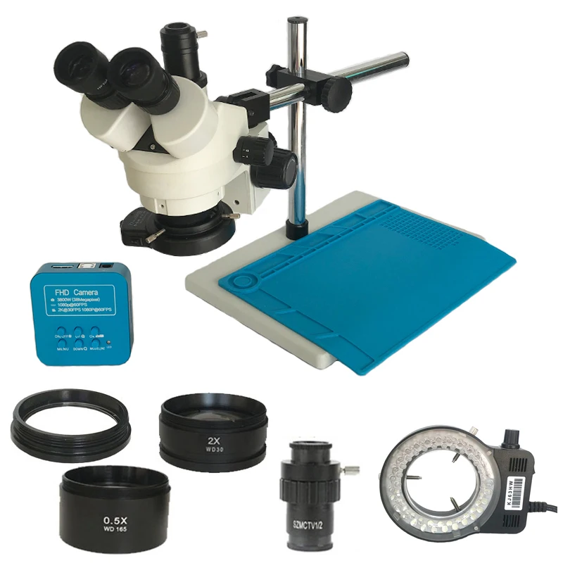Пакет incluede: 1 х тринокулярная Стерео Зум-головка 1 x пара супер Widefield 10X окуляров 1x56-светодиодная кольцевая лампа с адаптером селфи-Стик (12V) 1 x настольная подставка 1 x фокусировки стеллаж для выставки товаров Адаптер с-креплением-1 шт. 1 пара защитных очков 1 x крышка для защиты от пыли 1 x 0.5x объектив (для 3.5X -90X) 1 x 2.0x объектив (для 3.5X-90X)