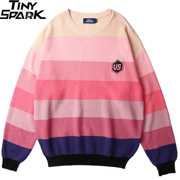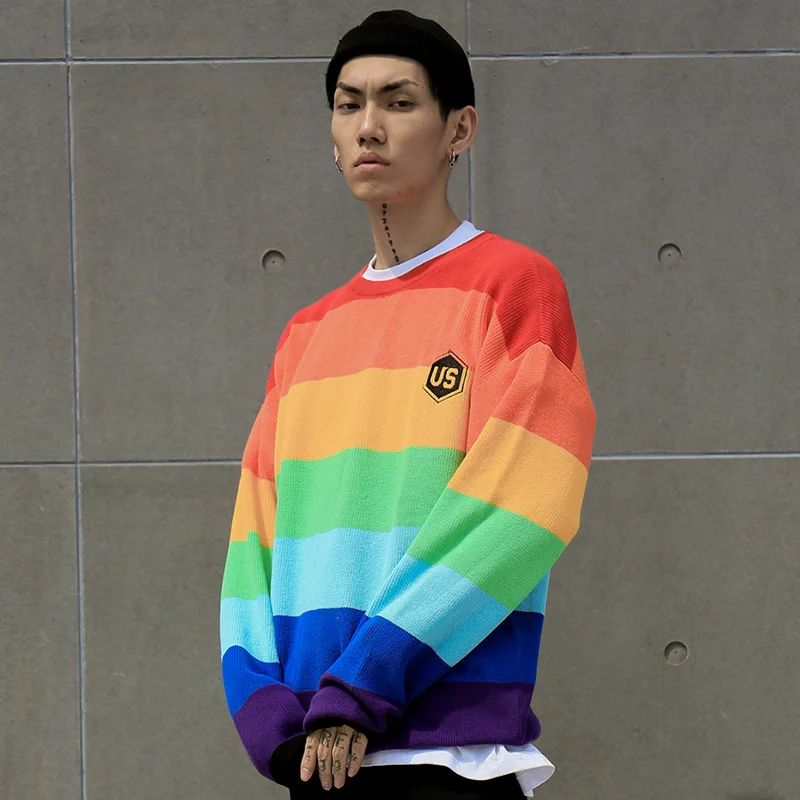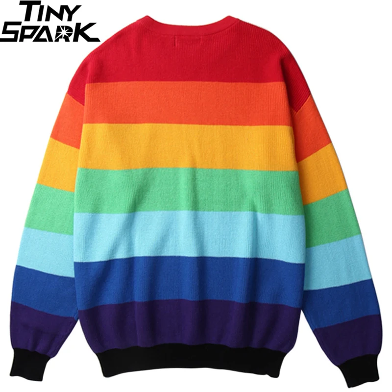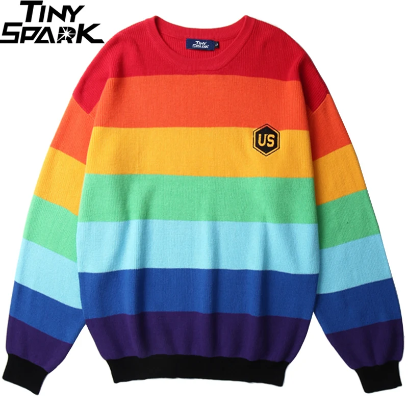 Мужской трикотажный свитер в стиле хип-хоп, 2019, в полоску, цвет радуги, свитер для улицы, пуловер 2019, Harajuku, свитер с вышивкой, хлопок