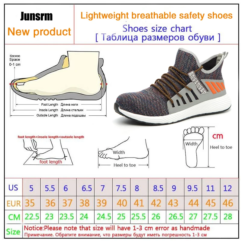 Рабочая обувь держится подальше от запаха стопы, Впитывает влагу и пот, Обеспечивает воздушный поток и воздухопроницаемость, Европейская стандартная стальная головка, Защищает пальцы ног от дробления и падения предметов. Пуленепробиваемые материалы могут защитить ноги От рабочих мест и экологических опасностей. Consejos: Se recomienda el tamaño estandar, pies de grasa de pie para disparar a una yarda grande. 1. Элидж Эль таманьо Сегун ла продольная де Ту пирог. 2. Si tu pie es Mama ancho o mus grueso, elige un tamaño mus grande. 3. Enviamos el tamaño de acuerdo con el tamaño de uno segum nosotros. 4. Como se mide manualmente, puede haber una diferencia de. 5. Si no estar seguro del tamaño correto, ponte en contacto con nosotros. [Sobre la calidad] fondo roto, desgasificación, rotura, diferencia de color grave, puntos graves. Esta tienda es responsable de todos los costes de procesamiento. Las cabezas de tornillo pequeñas, Las manchas pequeñas, el microtitre y La micropasta no son problemas de calidad. Aquhi esta cómo elegir el tamaño correto del zapato: Эль-Нумеро де таманьос Акви es totalmente diferente a la tabla de tallas de zapatos en tu pais, pero la longitud del pie desnudo nunca cambiara, ashi que debes medir el pie desnudo con una regla y селекционар Эль таманиньо con la siguiente tabla. AVISO важная: La longitud del pie no es la longitud de la plantilla. La longitud del pie no es la longitud de la suela. Longitud de пирог Европейский стандарт 12568 расширение anyi-smashing стальное одеяло и не grindingfeet