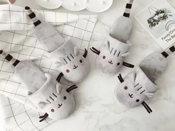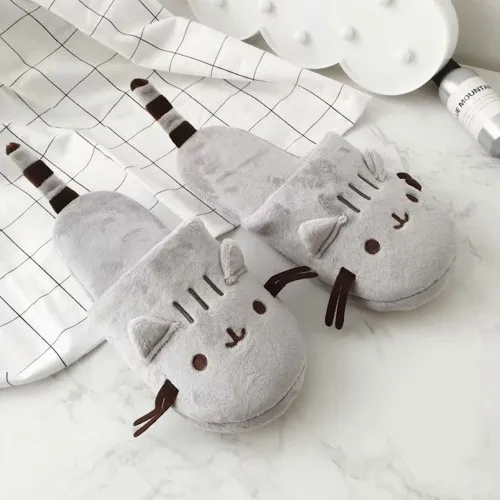 Тапочки женские зимние мягкие с набивным рисунком Серого Кота, Нескользящие