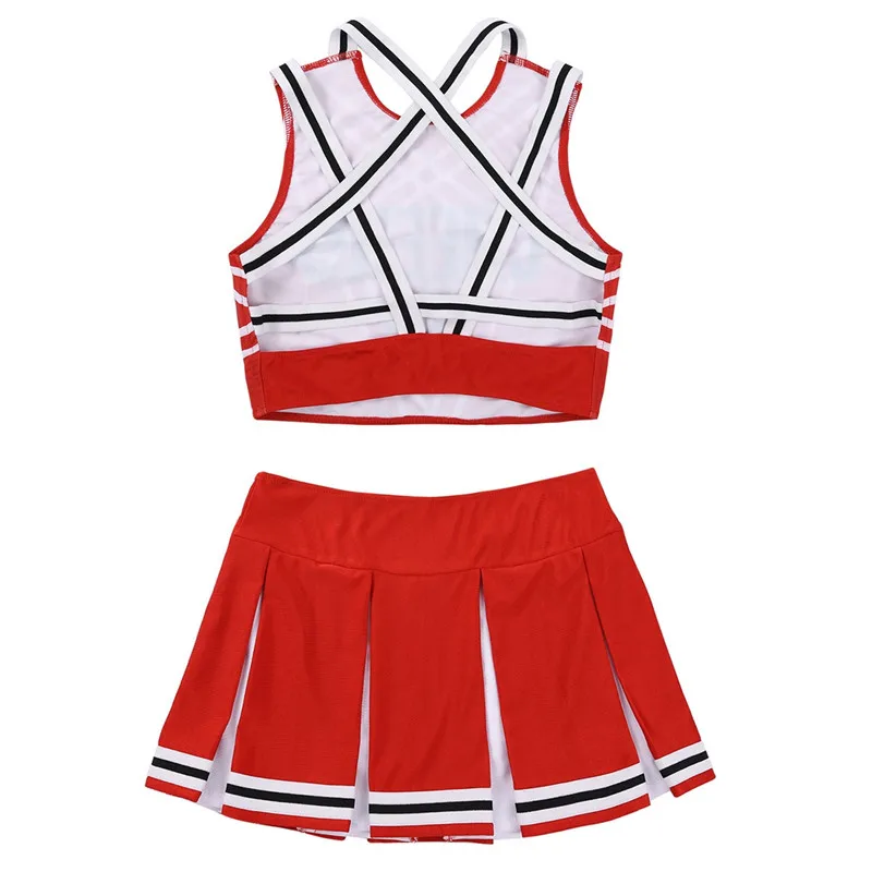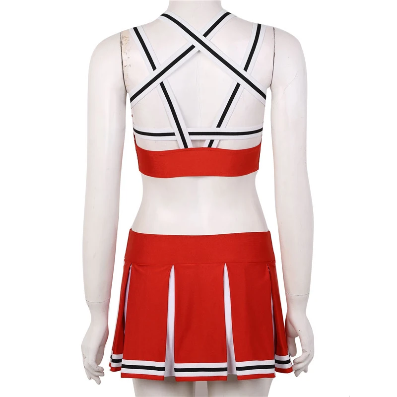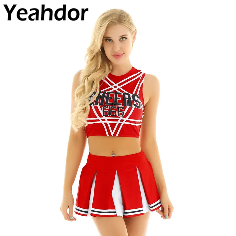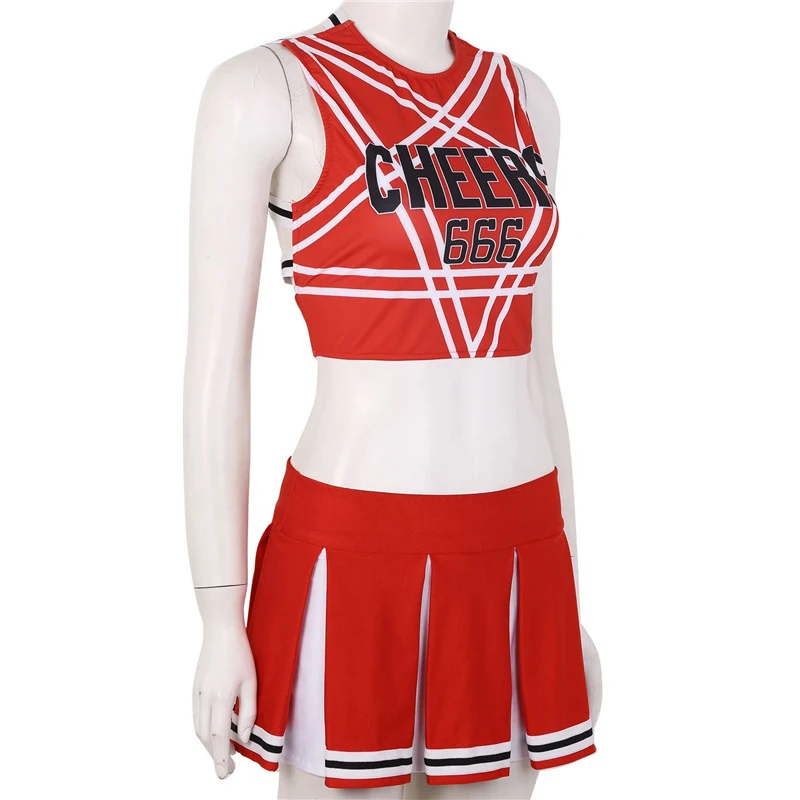 Особенности:Женский костюм черлидера для косплея, комплект униформы, застежка на пуговицах.Без рукавов и с открытой спиной, с эластичными бретелями, с пентаграммой сзади, с принтом спереди букв «CHEERS 666».Подходящая мини-юбка в складку с эластичным поясом, хорошая эластичная ткань, мягкая и удобная в носке.Хороший выбор для наряда, ролевых игр, сценических костюмов, карнавала, танцевальной одежды, танцевальных соревнований и т. д.Пожалуйста, обратитесь к описанию продукта для получения подробной информации о размере. Ручная стирка в холодной воде.