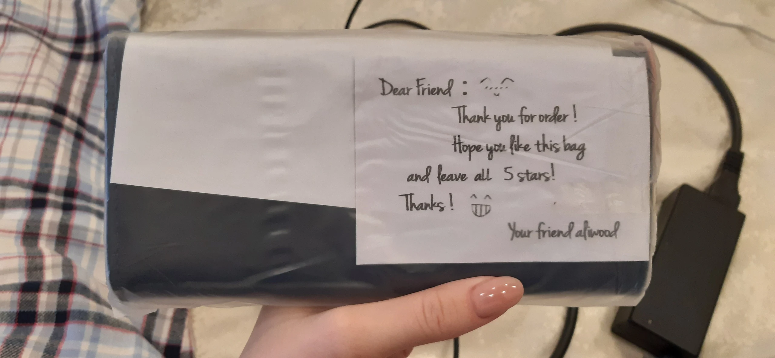 Товар дошёл достаточно быстро. Качество хорошее, приятный на ощупь. Отсек для сотового мне не подошёл, маловат (Honor10). Приятный бонус-резинка доя волос и сопроводительная записочка.
