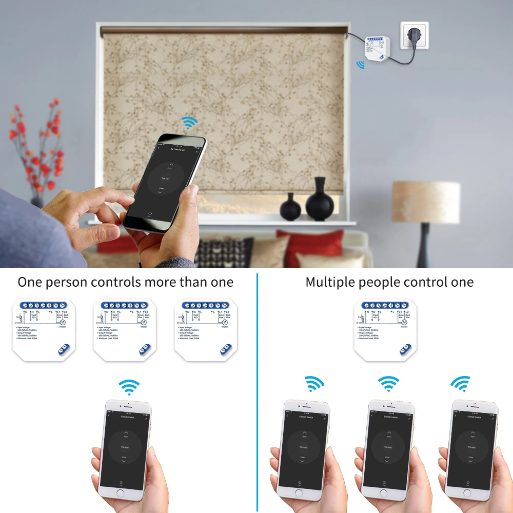 -Беспроводной, без провода, без ограничений, экономьте затраты на работу, чтобы установить физический роликовый переключатель затвора.-Модуль переключателя штор маленького размера, прост в установке.-Название приложения: Smart Life / Tuya.-Дистанционное управление мобильным приложением, синхронизация приложений, Поддержка iOS и Android.-Открыть/закрыть автоматически в соответствии с заданным вами расписанием.-Голосовое управление, Google Home, Amazon Echo Alexa.