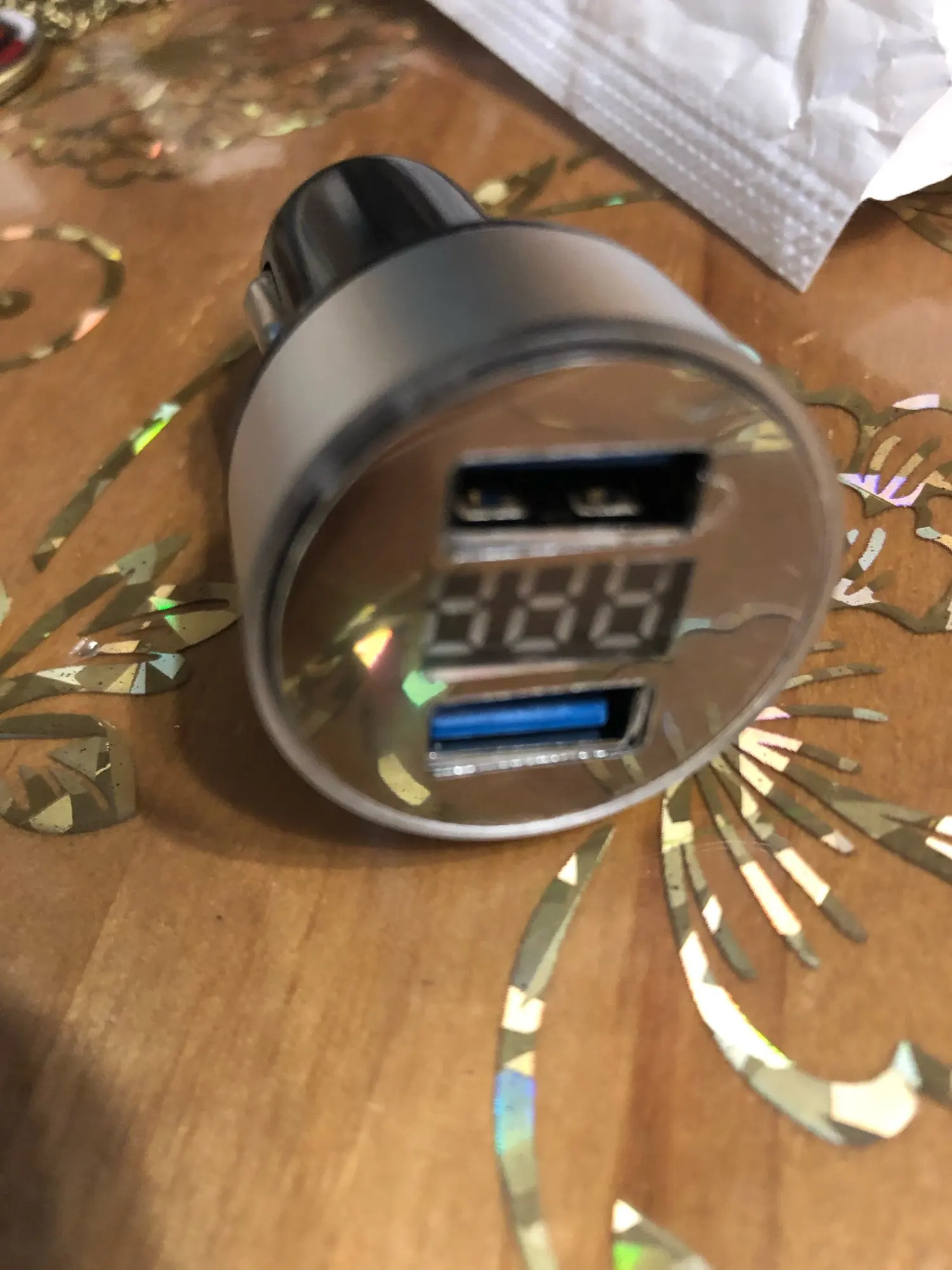 Зарядное устройство для гаджетов в автомобиле. Два USB-разъёма позволят сразу два устройства подключать к одному гнезду. Есть цифровой индикатор напряжения зарядки. Описанию товар соответствует полностью. Покупкой доволен. Рекомендую товар и поставщика. Доставили в Москву за две недели в общей упаковке для нескольких заказов.