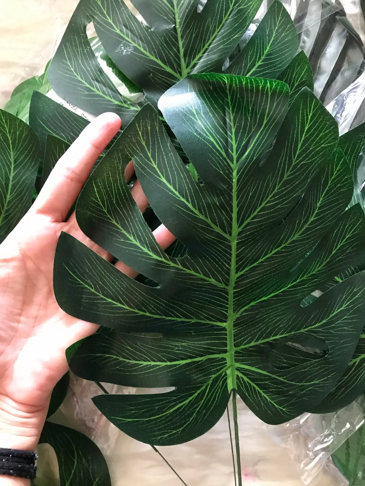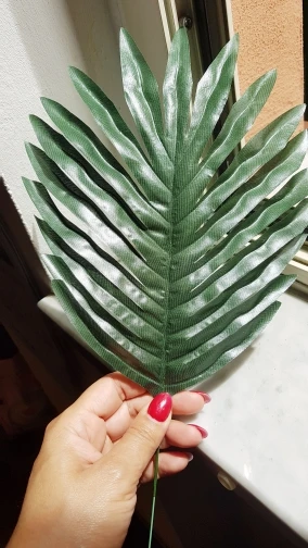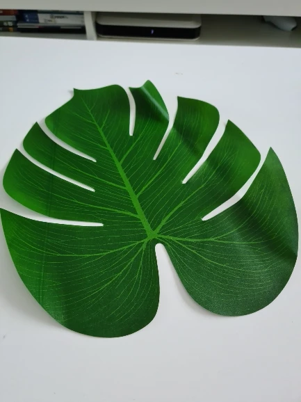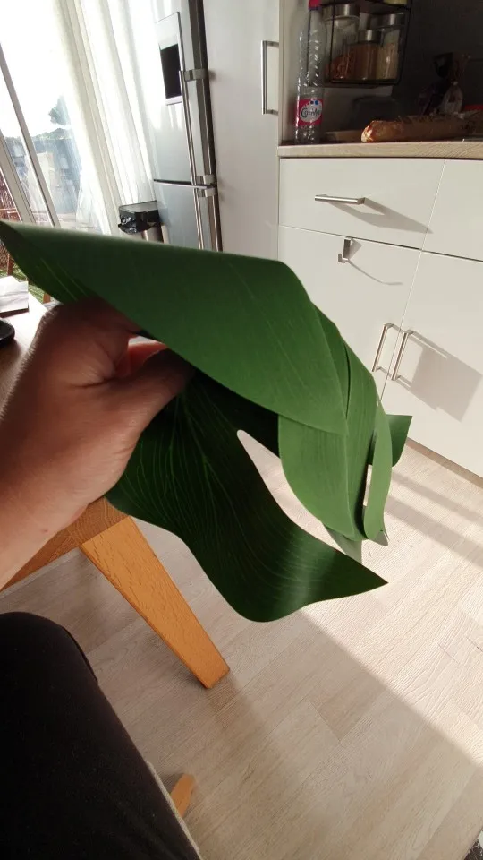 сам листок маленький 19.5 х 23,5 см. Издалека выглядит хорошо и цвет хороший насыщенно-зеленый Но сделан то ли из тонкой бумаги, то ли из тонкой клеенки. В общем барахло . Если он где-то подальше в темном месте то не видно, выглядит хорошо.Но если в вазу на стол- НЕТ!!!