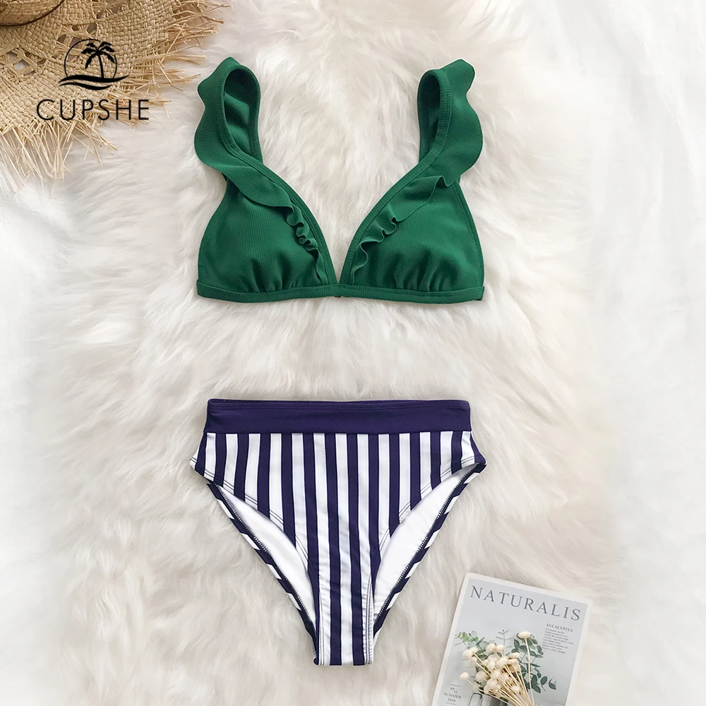CUPSHE Цельный купальник бикини в полоску с рюшами, сексуальный купальник с треугольным вырезом и чашечками, купальник из двух частей, женский купальник 2020, пляжные купальники