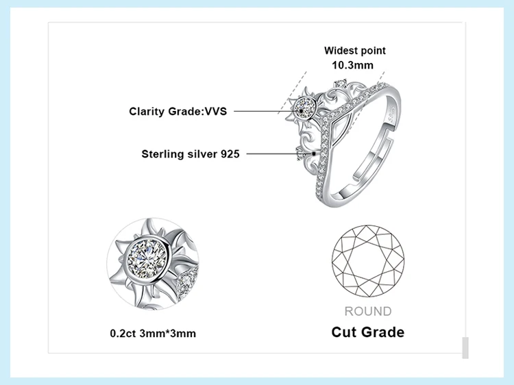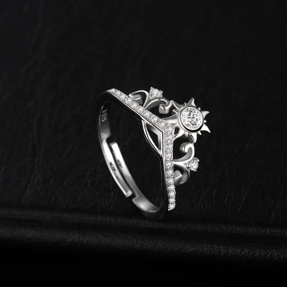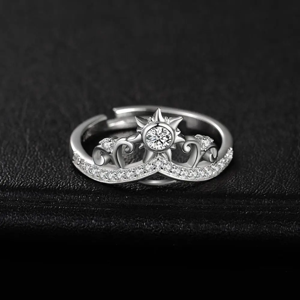 Celebrate your love with this stylish crown ring. Crafted in 925 sterling silver, this precious look features a round cubic zirconia center stone surrounded with detailed scrollwork to showcase a celestial sun symbol. A vintage-inspired curve band completes the design. Polished to a bright shine, this charming open ring will be a choice she loves.