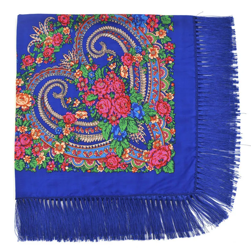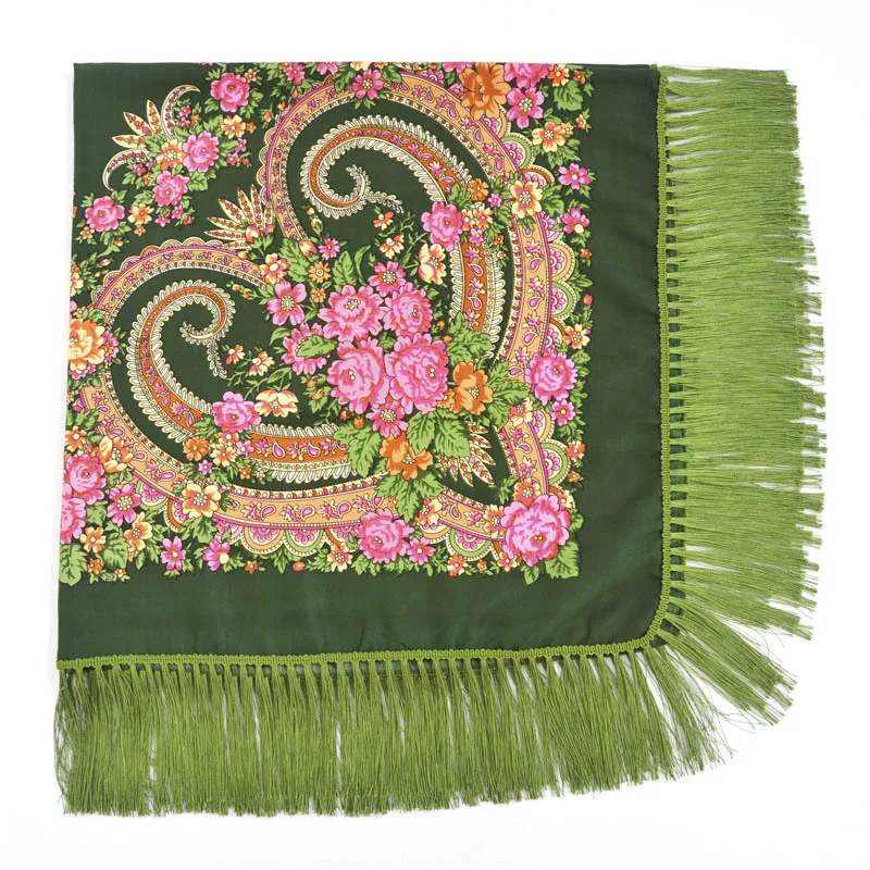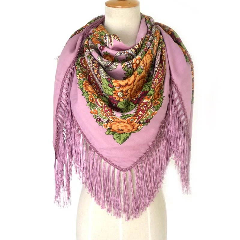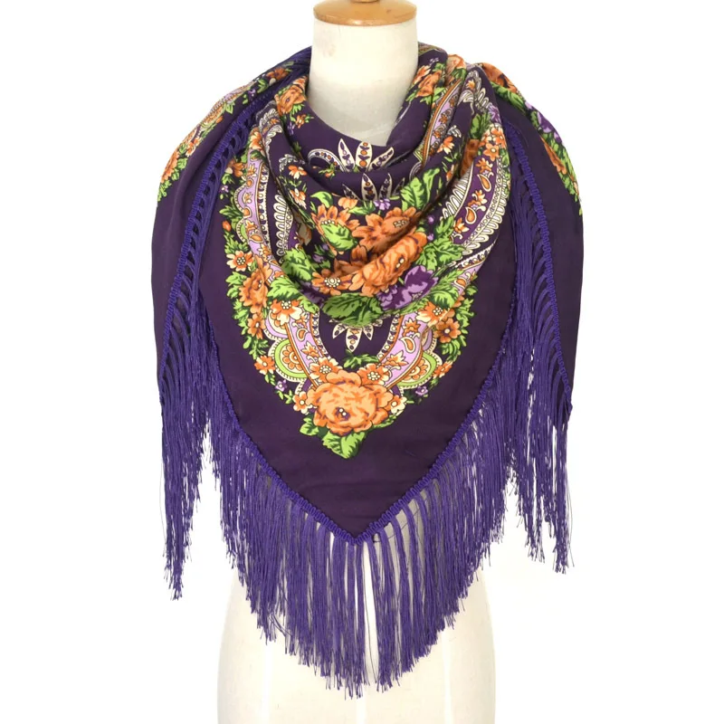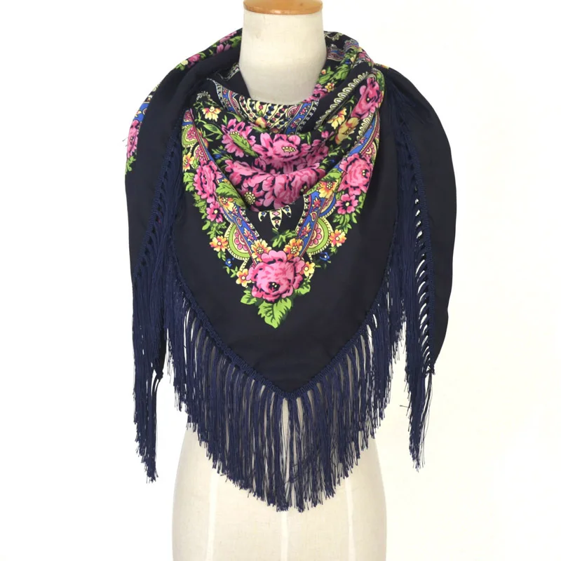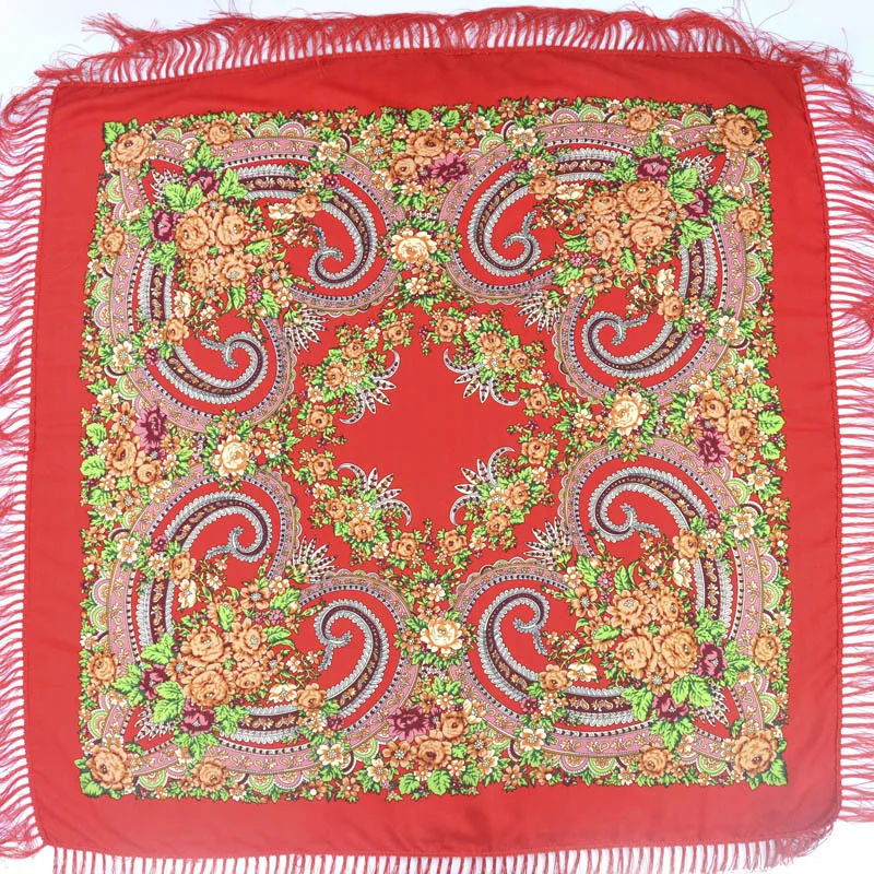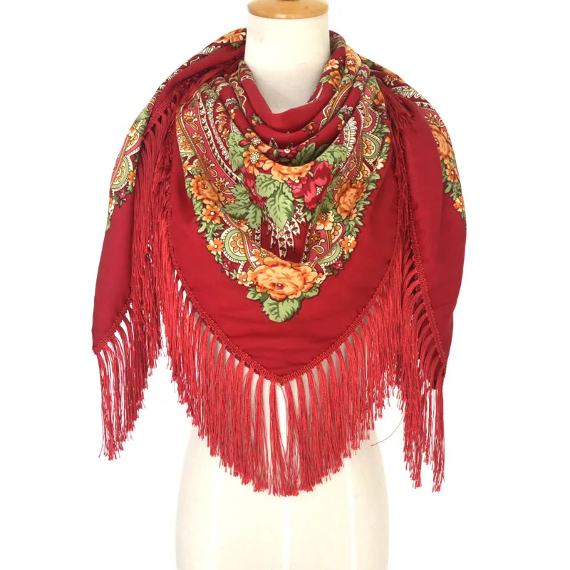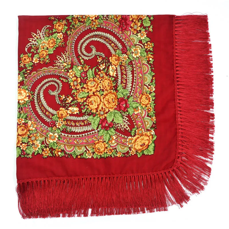 Квадратный шарф из хлопка, в русском ретро стиле, 135x135 см, с цветами и кисточками, Дамский зимний шарф, одеяло, шаль, Пашмина