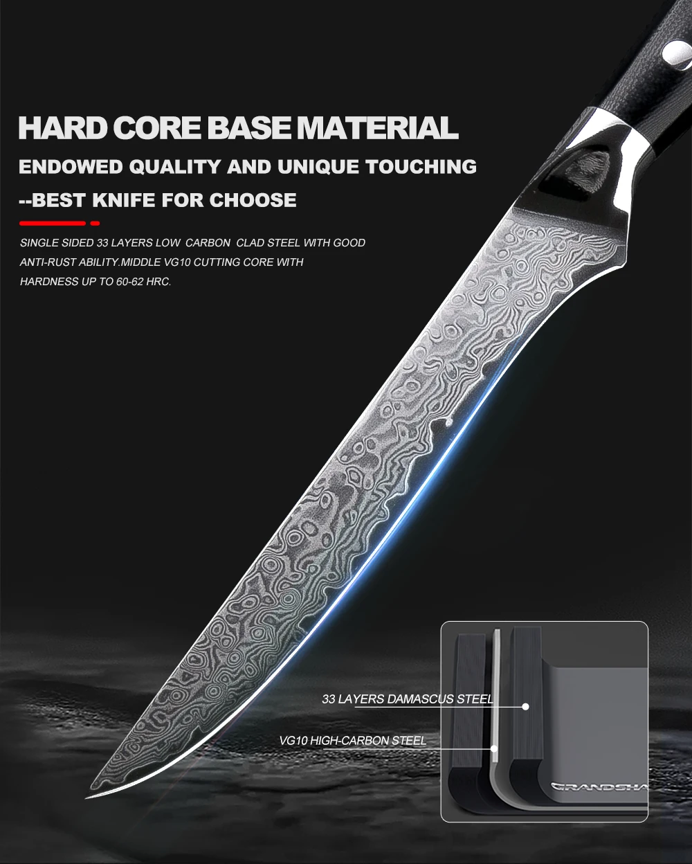 33-слой Нержавеющая сталь SUS430 & SUS431 на каждой стороне обеспечивают работу Совместного; HRC 60-62 твердость.
