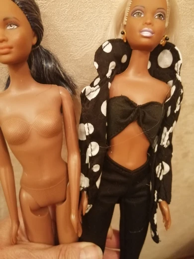 Обшарпанное. Темные подтеки на пластике ног. Ноги сгибаются на 1 щелчок. Туловище из лёгкого пластика, руки и ноги прорезиненный пластик. Цвет типа афра у барби.