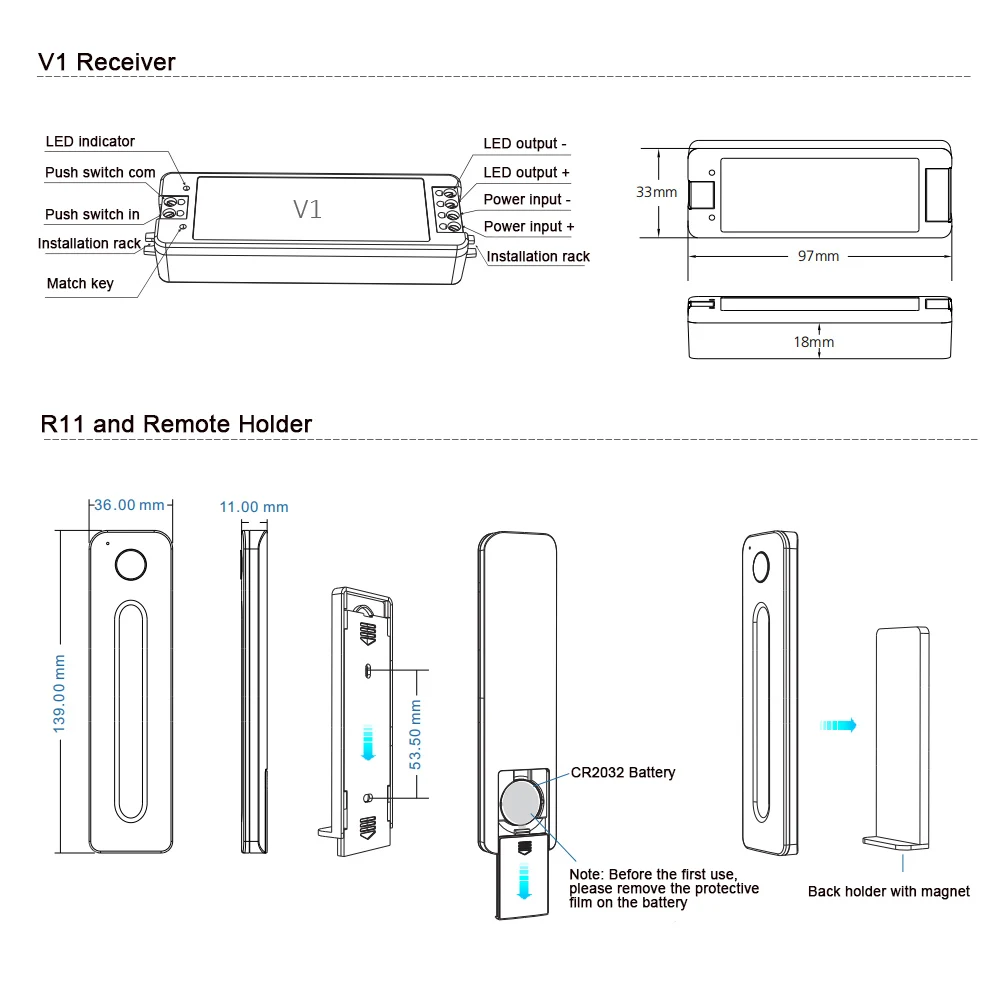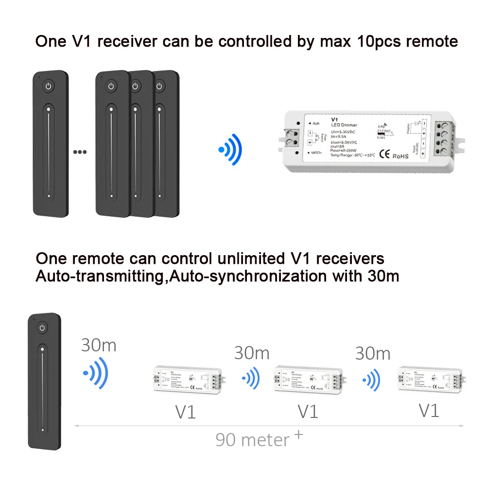 Диммер может сочетаться со всеми видами пульта дистанционного управления 2,4G RF с одной или несколькими зонами.