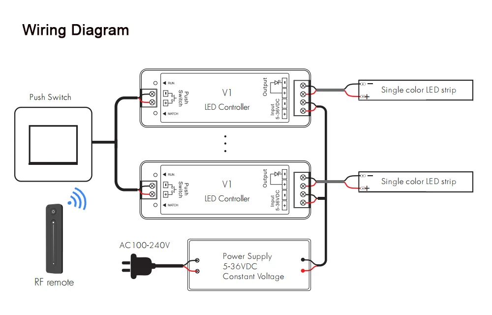 ● Применяется к одноцветному, двухцветному или RGB светодиодному контроллеру.