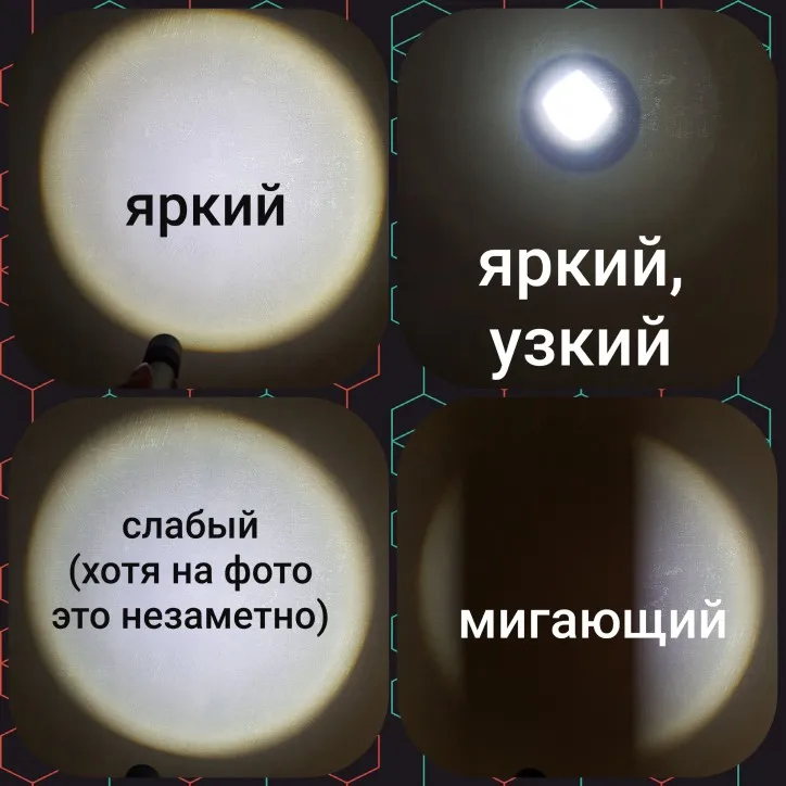 Фонарик неплохой и в целом соответствует описанию, ожидал что будет светить ярче. Пришел с заряженным аккумулятором, что очень здорово. Единственное, что не очень удобно его выключать, приходится перебирать кнопкой все 4 доп режима. Покупкой доволен.