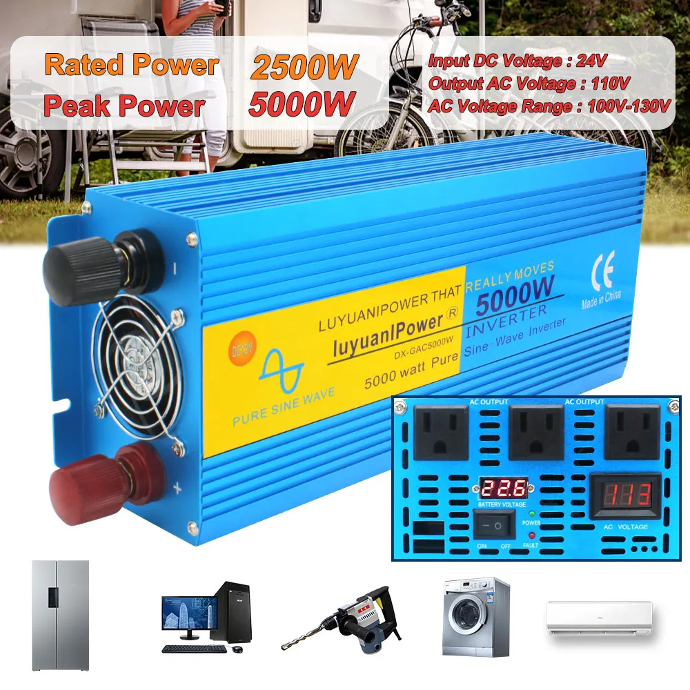 Характеристики:Новый инвертор постоянного тока в переменный токФорма выходного сигнала: Совершенно новая чистая Синусоидальная волнаНоминальная мощность: 5000 ВтНепрерывная выходная мощность: 2500 ВтЧастота: 220 В переменного тока/50 Гц ± 2 Гц; 110 В переменного тока/60 Гц ± 2 ГцБез нагрузки ток: <0,8 амперЭффективность версии: >90%Входное напряжение постоянного тока: 12 В/24 ВDC Напряжение диапазон: 9V-15,5 VВыходное напряжение переменного тока: 220 ВДиапазон напряжения переменного тока: Универсальная вилка: 210-240 В; Штепсельная вилка США: 100-130 вНизкая Напряжение сигнализации: 10V постоянного тока ± 0,5 VНизкая Напряжение выключается: 9 В переменного тока ± 0,5 VПерегрузка: выключение выходаПо сравнению с Напряжение выключается: 15,5 VПерегрев: выключить выход автоматическиПредохранители: короткое замыканиеСтарт: мягкий стартЗащита: перегрузка, короткое замыкание, перегрев, обратная полярность, под/надНапряжениеВентиляторы охлажденияСостояние производства: абсолютно новый2 года гарантии: (1 год производитель + 1 год VMInnovations)Размер машины (мм): Универсальный/Американский штекер: 420 мм * 150 мм * 90 ммВес нетто (кг) : 5 кг2 входа Vottage: 12VВыходное напряжение: 220 В переменного тока/50 Гц ± 2 Гц; 110 В переменного тока/60 Гц ± 2 ГцВыход USB: 3.1AБез тока нагрузки: <0.9AЦифровой дисплей: вход/выходное напряжение 4LCD дисплей (зарядка/вход/выход/мощность нагрузки)Преобразование? Эффективность: 90%Внешний вид-Цвет: синий-Материал: алюминиевый сплав-Тип разъема: Универсальная/Американская вилка-Встроенный вентилятор охлаждения с низким уровнем шума.-Usb-интерфейс для зарядки.-Положительный и отрицательный полюсный терминал-Ручной выключатель инвертораБезопасный Диапазон входного напряжения:Подходит для: ① 12V: 9,8 ~ 15В8 функция защиты безопасности:①Reverse защита от обратной полярности②Низкое входное напряжение? Защита③ Защита от высокого входного напряжения④ Защита от перегрузки по току⑤Short защита от короткого замыкания⑥Over защита от высоких температур⑦Overload защиты⑧ Внутренний предохранителиПосылка в комплекте· 1x2500W/5000W DC 12V к AC 220V or110V чистая синусоида инвертор· Кабель с зажимом для аккумулятора-2 шт.· 6 предохранителей· Руководство пользователяОбратите внимание:1. Убедитесь, что Номинальная мощность выше, чем устройство, которое вы хотите применить.2. Если вы хотите одновременно запускать несколько устройств, вы должны обратиться к общей мощности.3. Если вы хотите работать с индуктивной нагрузкой в течение длительного времени, выберите чистый синусоидальный инвертор.4. Пожалуйста, используйте стандартные кабели батареи, которые мы отправили, или полная выходная мощность не может быть гарантирована. И Запасные предохранители в посылка просто используются, когда оригинальные сгорели случайно.5. Пожалуйста, не подключайте инвертор к сети питания, и обратное соединение положительного и отрицательного также запрещено.6. Пожалуйста, не перегружайте. Если ваши приложения индуктивные нагрузки, пожалуйста, выберите инверторы, непрерывная мощность которых в 3-7 раз выше, чем Ватты ваших приборов. Такие как холодильник, ледяной ящик, дрель, стиральная машина, водяной насос, микроволновая печь, духовка, пылесос, фен и т. д. с двигателем внутри. Пожалуйста, убедитесь, что постоянная мощность нашего инвертора отвечает вашим потребностям перед заказом, или проконсультируйтесь с нами для получ