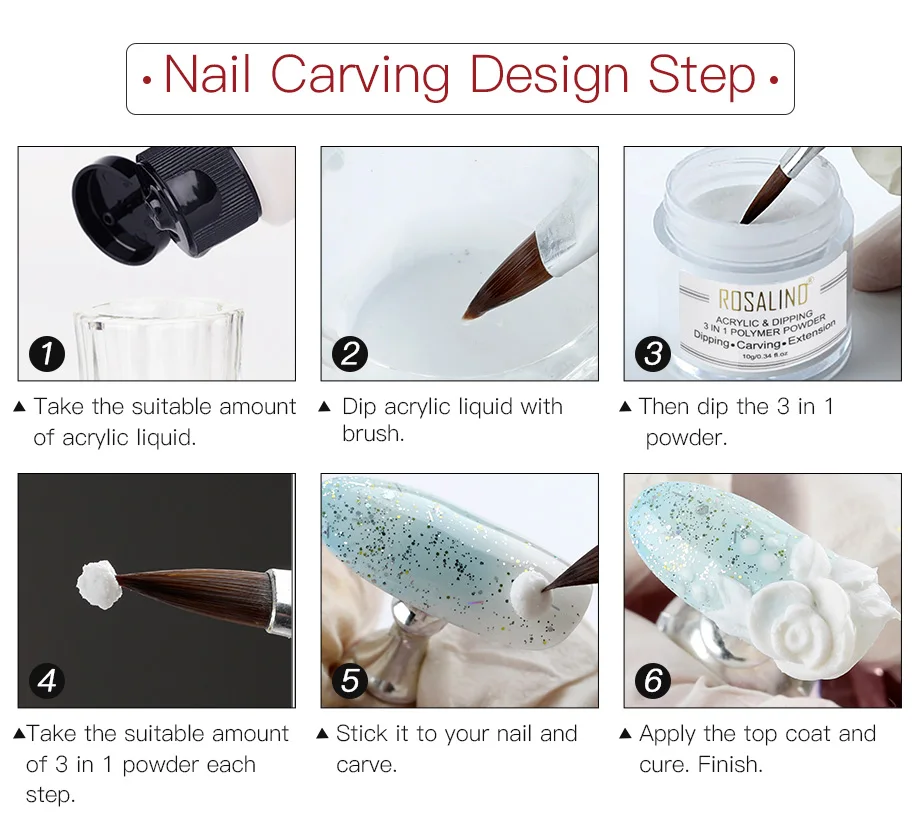 Шаг для наращивания ногтей: 1. Нанесите базовый слой, вылечите светодиодный/УФ-лампой. 2. Нанесите форму ногтя на ваш ноготь. 3. Нанесите акриловый порошок акриловой жидкостью на гвоздь. 4. Нанесите его на гвоздь. Подождите, пока он высохнет. 5. Снимите форму ногтя. 6. Обрежьте форму ваших ногтей. 7. Нанесите верхнее покрытие, вылечите светодиодный/УФ-лампой. 8. Отделка. Дизайн резьбы по ногтям шаг: 1. Окуните кристаллический акриловый порошок акриловой жидкостью кисточкой. 2. Приклейте его к ногтю и вырежьте. Подождите, пока он высохнет. 3. Нанесите верхнее покрытие, вылечите светодиодный/УФ-лампой. 4. Отделка. Сверкающие Украшения шаг: 1. Нанесите базовый слой, вылечите светодиодный/УФ-лампой. 2.Dip-наконечник всего ногтя в блюдо, отчистите излишки порошка. 3. Нанесите активатор погружения, подождите, пока не высохнет воздух. 4. Нанесите верхнее покрытие, вылечите светодиодный/УФ-лампой. 5. Отделка.