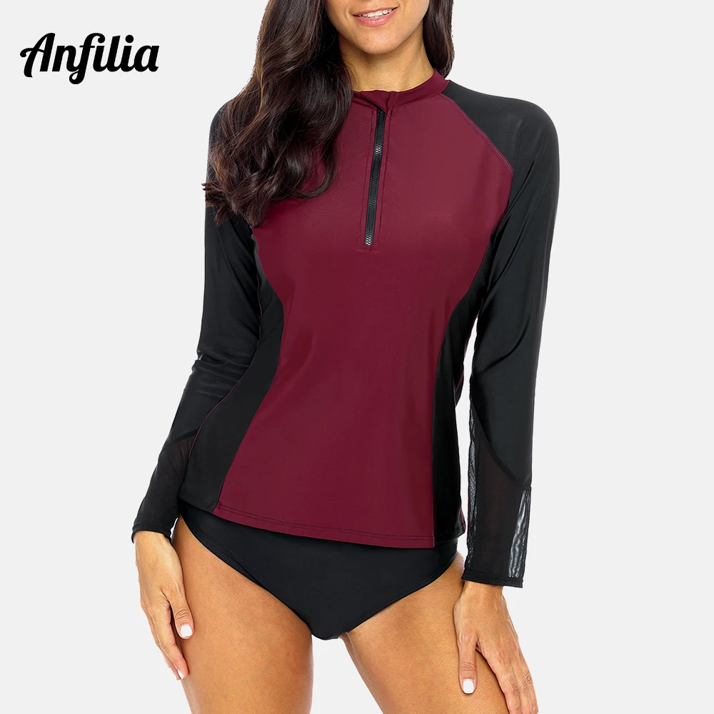 Женский купальный костюм Anfilia, рубашка с длинными рукавами и застежкой-молнией спереди, купальный костюм в стиле пэчворк, топ для серфинга, рубашка для пеших прогулок, Рашгард UPF50 +