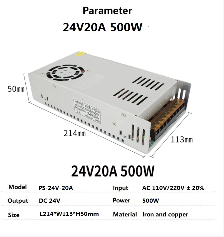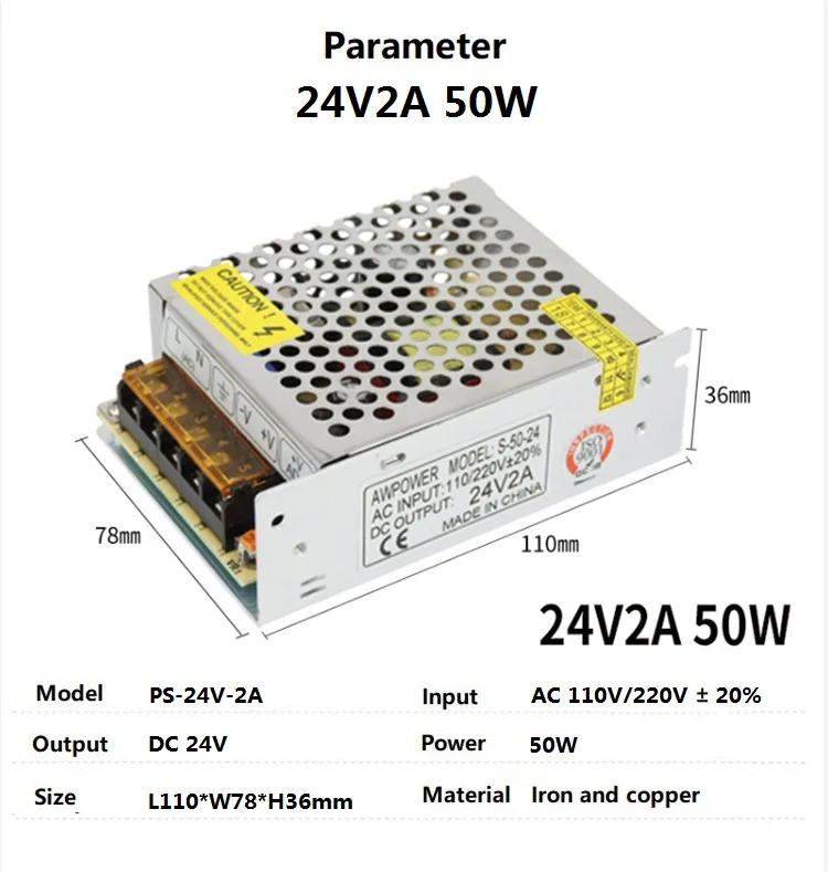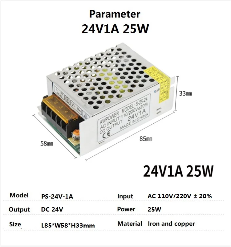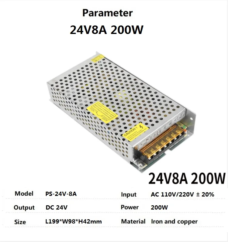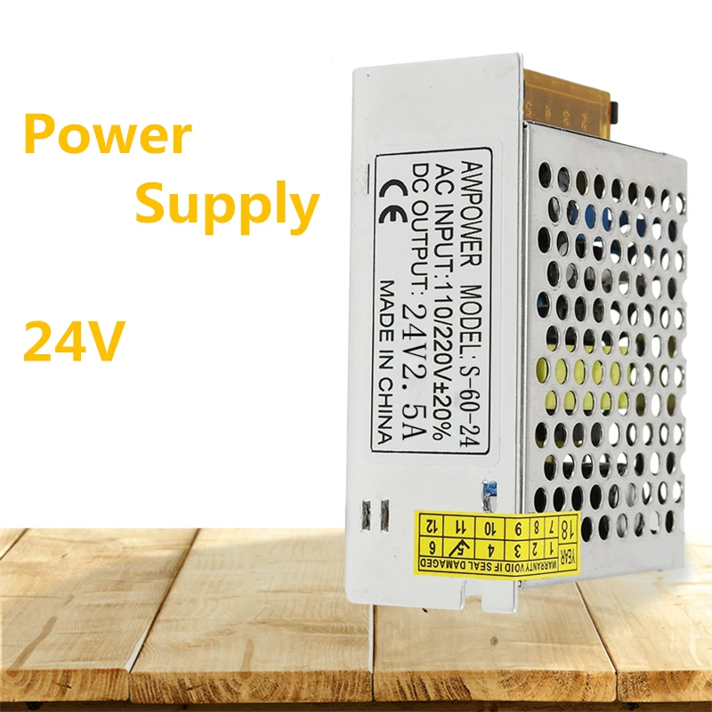 Светодиодный импульсный источник питанияВход 110V/220VacВыход 24VDCCurrent1A/2A/3A/4A/5A/8A/10A/15A/16,5/20AМощность 25/50/75/100/120/200/250/360/400 ВтШнур питания не входит в комплект по умолчаниюЕсли вам нужен шнур питания, необходимо купить его у опции EU/AU/US/UKШнур питания 1,5 метров в длину, 3*0.75m2 кабель