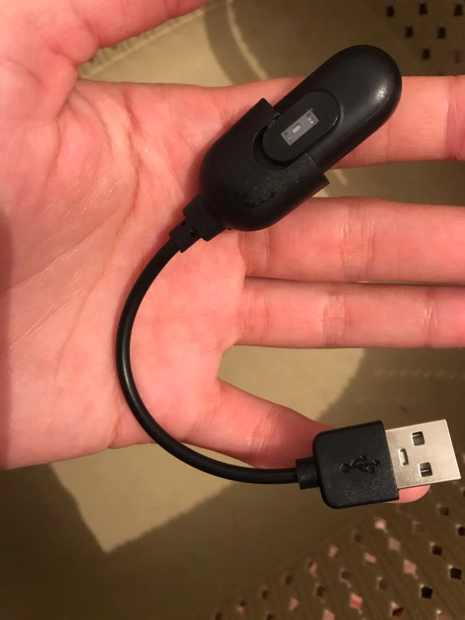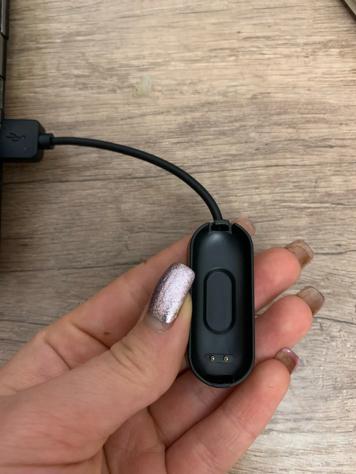 Посылка шла долго. Кабель хорошо подходит на силиконовый браслет - удобно, можно не вынимать. На магнитном браслете - не .заряжает