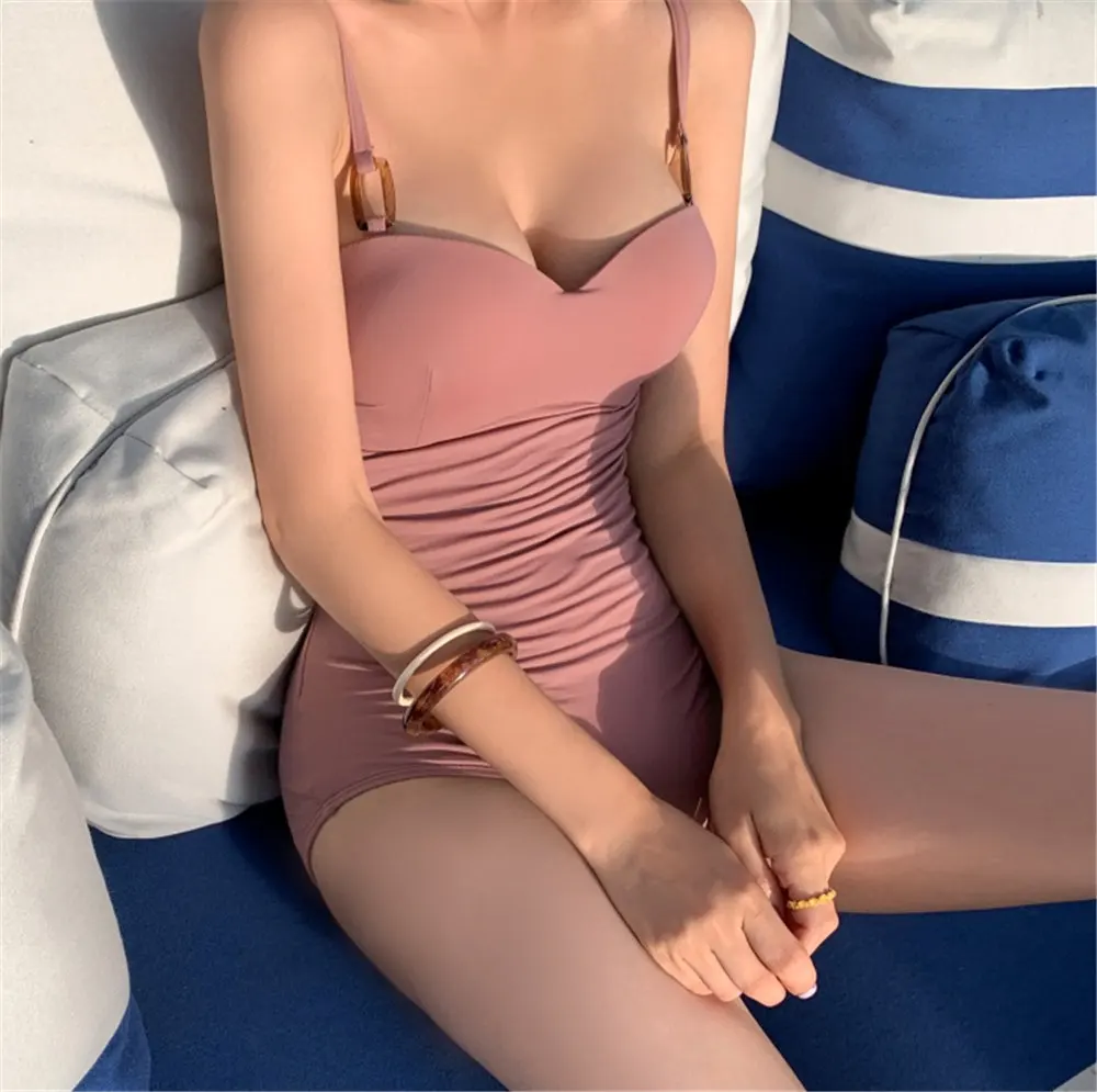 Сексуальный цельный купальник бандо женский однотонный купальник монокини в Корейском стиле пуш-ап купальник со складками
