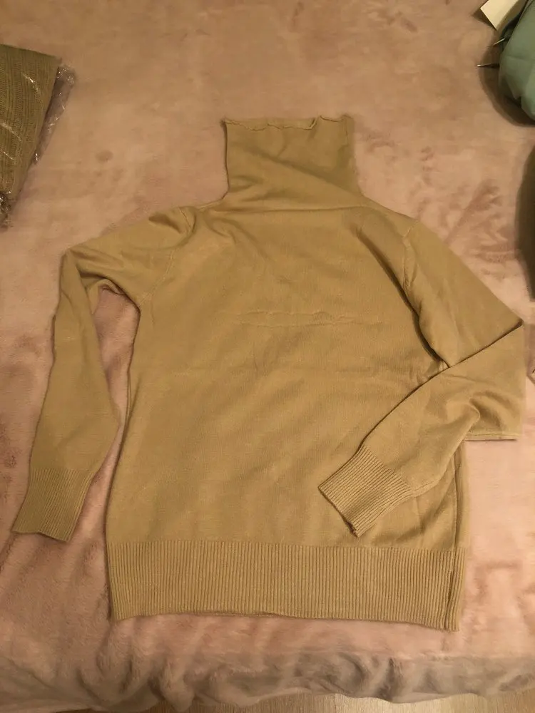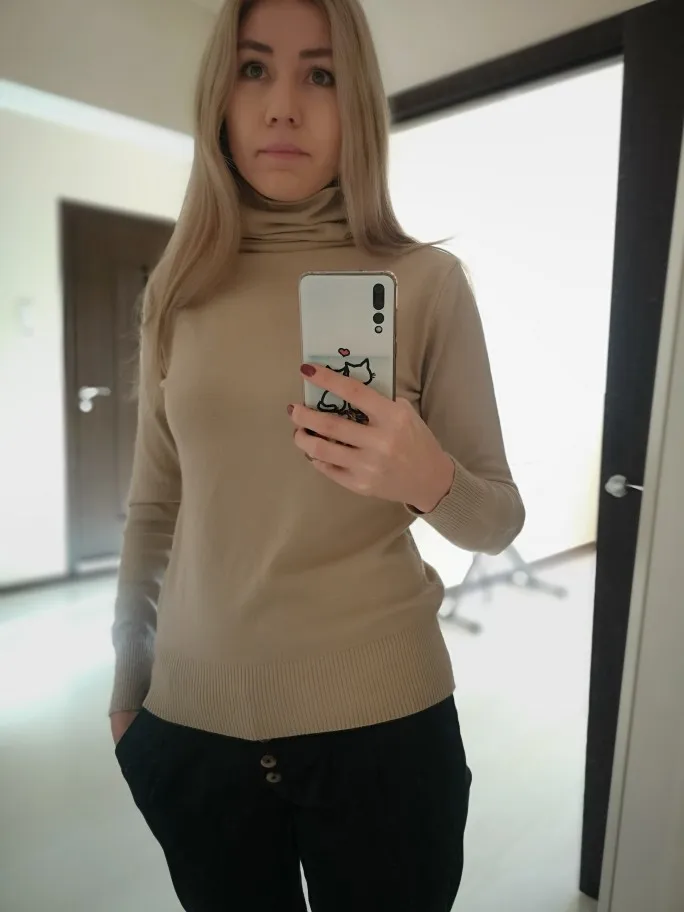 Заказала 2 кофты, бежевую и белую, водолазка очень мягкая и приятная на ощупь, это плюс, а по минусам просвечивает, есть небольшой запах, обнаружила грязное пятно, надеюсь отстирается