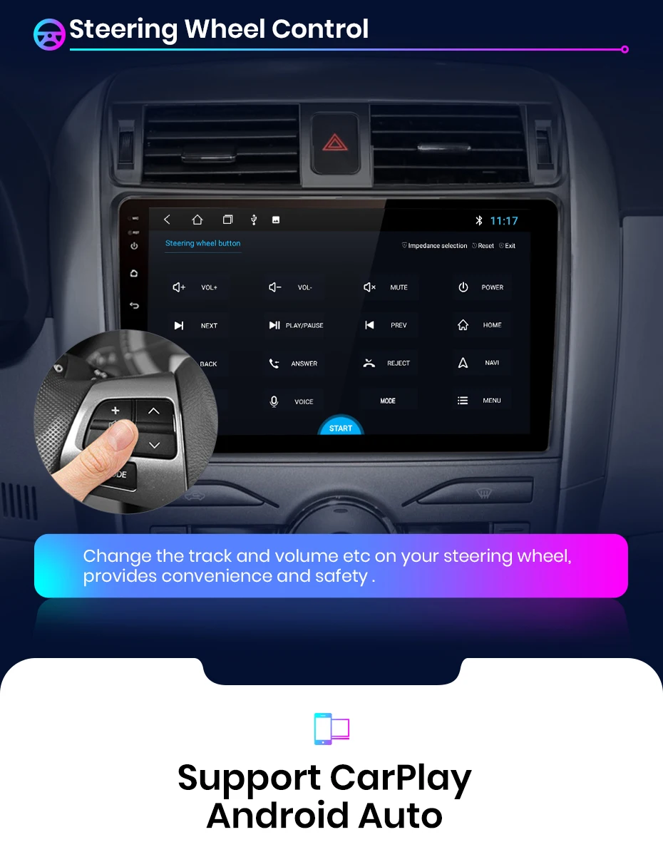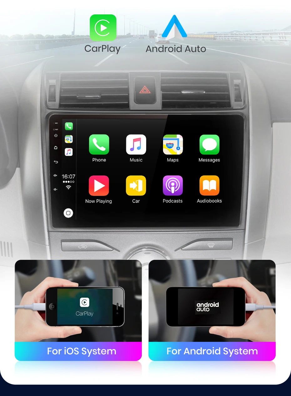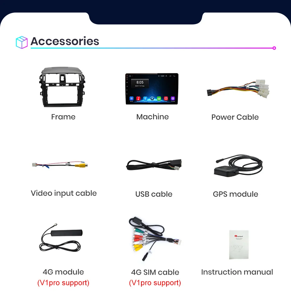 >> Junsun V1 For Toyota Corolla E140 E150 2008 2009 2010 2011 2012 2013 Function> Основные функции: Android 10.0 + 9-дюймовый IPS-экран + четырехъядерный процессор 1,2 ГГц (восемь ядер 1,8 ГГц дополнительно) + флэш-память DDR3 1 ГБ (2 ГБ / 4 ГБ / 6 ГБ дополнительно) + 16 ГБ памяти (32 ГБ / 64 ГБ / 128 ГБ дополнительно) + WIFI ( Сеть 4G опционально) + Зеркальное соединение + Управление рулевым колесом + RDS / DSP (опционально)> Специальные функции:1. PIN-код к PIN-коду: кабель питания радио Junsun - это контактный штырь, прост в установке;2. Встроенный Carplay / Android Auto: поддержка версии V1 / V1Pro, просто используйте телефонный кабель, подключите его, стабильный и простой в использовании;3. Поддержка подголовника: поддержка только версии Junsun V1;Дополнительные аксессуары> Управление голосом AI: просто произнесите командное слово, управляйте радио без рук, сделайте вождение более безопасным> Камера ADAS DVR, мониторинг давления в шинах, OBD2, внешний микрофон, кабель RCA;