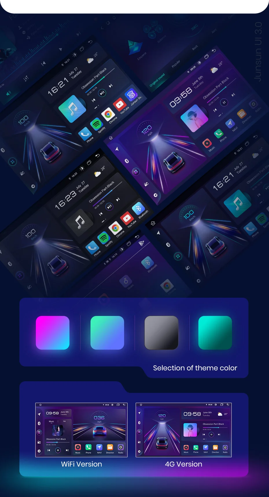 Недавно выпущенная версия Junsun UI 3.0 будет работать более удобно, потому что большинство ваших ежедневных потребностей в вождении будут удовлетворены этим пользовательским интерфейсом, сделав интерьер вашего автомобиля более крутым.Пожалуйста, обрати внимание:- Текущее оборудование с местных складов в Испании, Польше и России по-прежнему представляет собой Junsun 2.0 UI. Если вам нужно обновить версию Junsun UI 3.0 после покупки, свяжитесь с нами, чтобы обновить прошивку.- Из Китая отправлено устройство версии Junsun UI 3.0.- О цвете темы, V1 только один цвет, а V1 Pro имеет 4 цвета на выбор