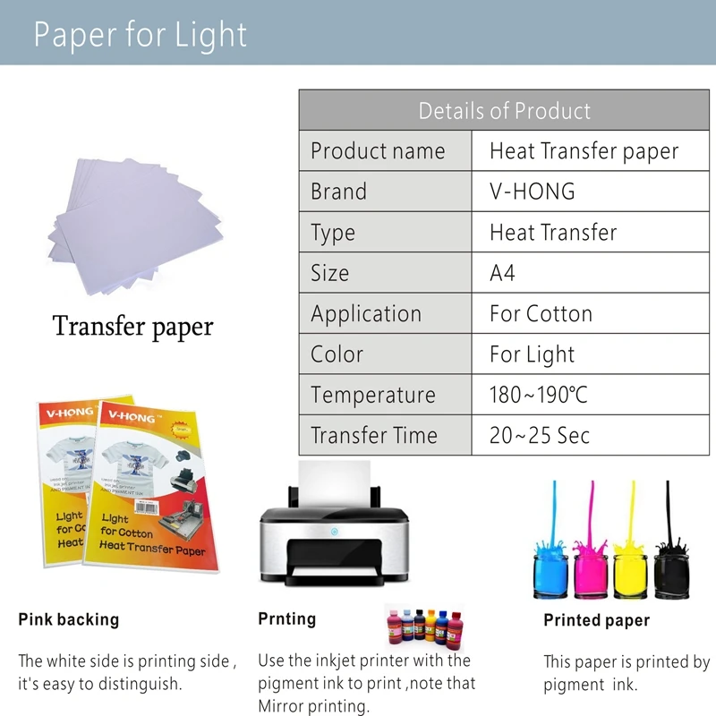 После получения бумаги, это пустая бумага. Покупатель печатает его на бумаге с помощью принтера в соответствии с дизайном бумаги. Затем переводная бумага помещается на поверхность одежды для нагрева. Покупатель с условиями может использовать специальное оборудование для отопления. Обычная семья может использовать бытовой утюг для глажки