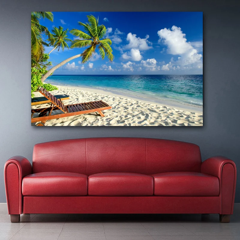 Настенные плакаты с изображением пляжа, пейзажа, пальмы, песка, морского неба, тропиков, пейзажа, принты на холсте, шелковые картины для декора гостиной