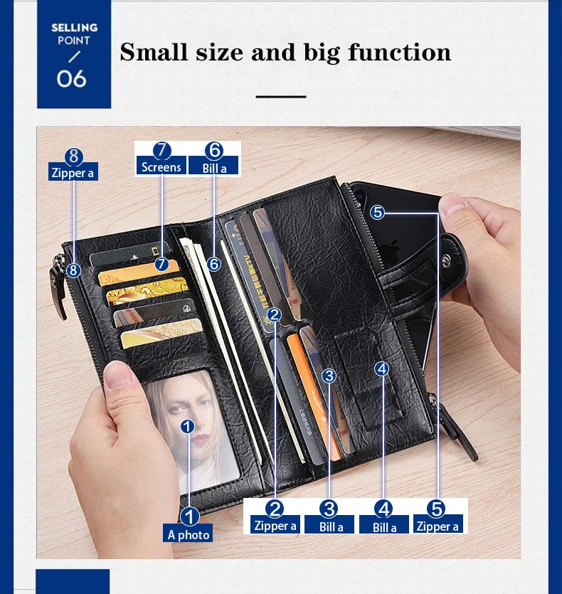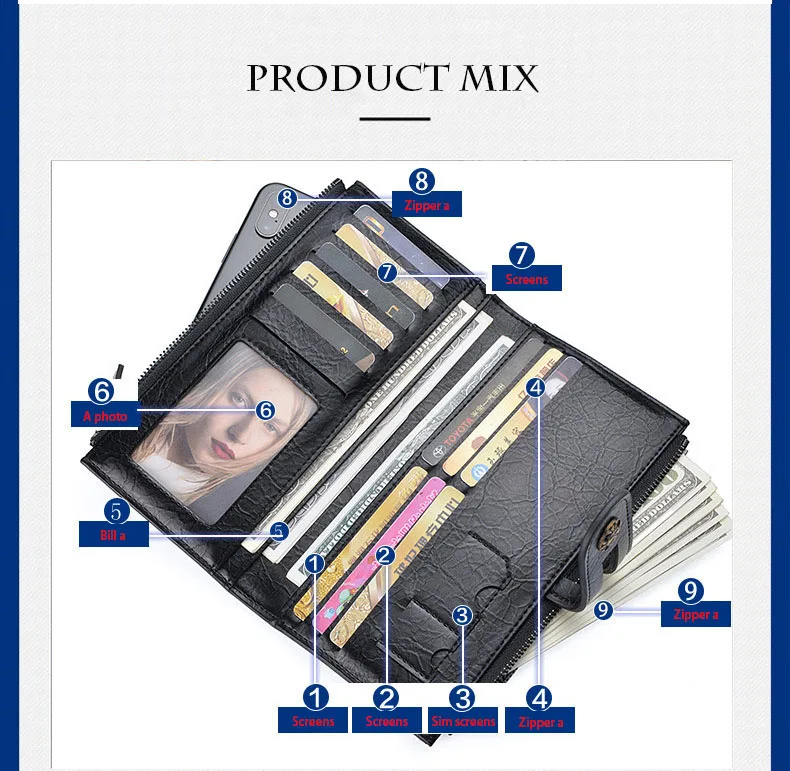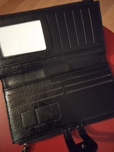Бумажник неплохой. Удобный, много отделений для карточек, несколько для купюр и два отделения, в которые помещается телефон. Строчки, подкладка, молнии, все детали выполненны качественно. Также основная кнопка имеет два положения: для обычного наполнения и для более полного. Единственный минус - материал не кожа. Поэтому оценка ниже!