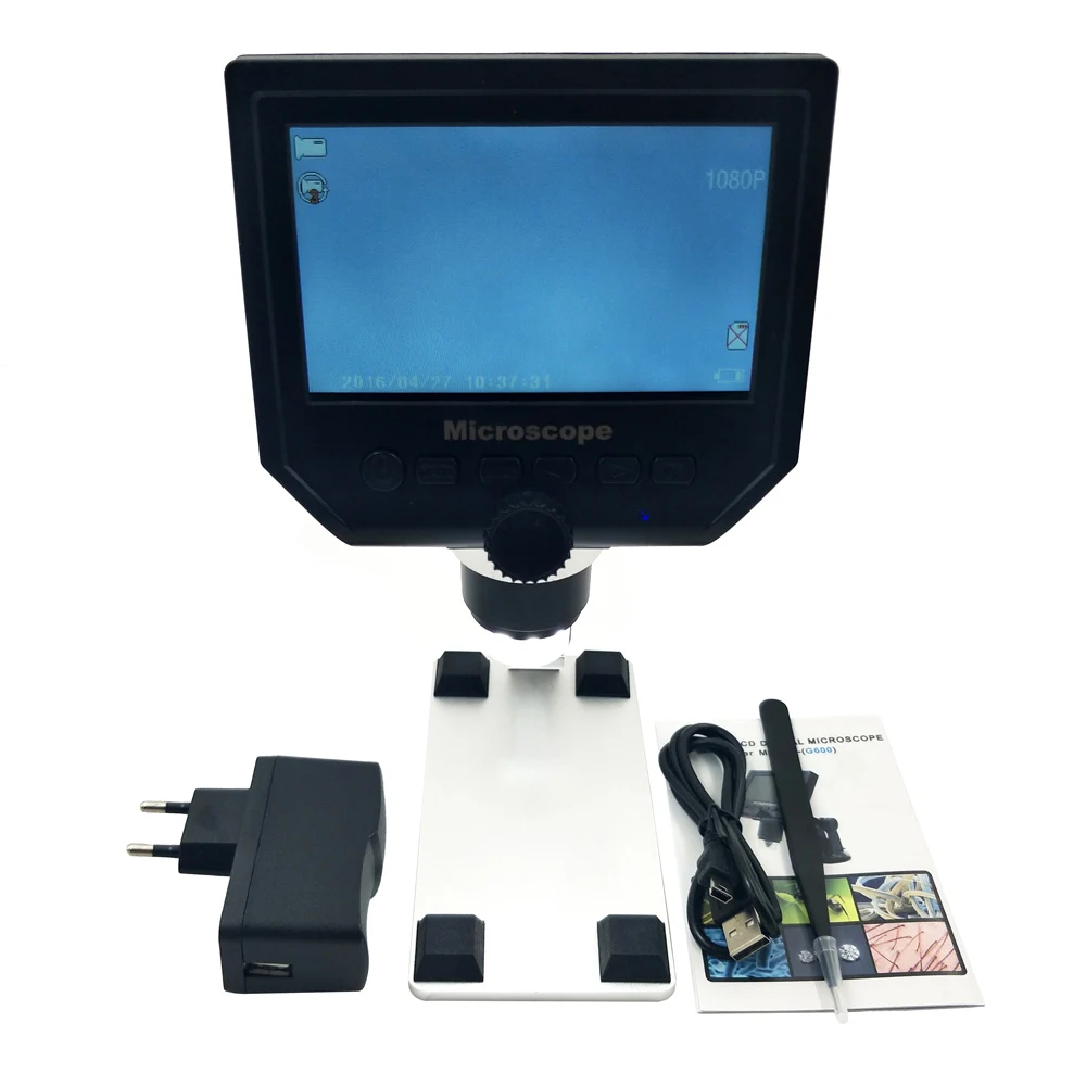 Описание: 4,3 дюймовый ЖК-дисплей HD электронный микроскоп с 600X увеличением, регулируемой высокой яркостью 8 светодиодов, 16 языков и портативным размером, этот цифровой микроскоп поможет вам видеть и анализировать мелкие предметы в микроскопических деталях. Встроенный литиевый аккумулятор может работать непрерывно в течение 6 часов. Поставляется с металлической или пластиковой опорой для поддержки микроскопа. Откройте для вас двери микромира. Особенности: HD 3,6 МП CCD обеспечивает четкое изображение и помогает легко видеть мелкие объекты с помощью профессионального микроскопического объектива. Встроенная литиевая батарея может работать 6 часов подряд. 2,8-дюймовый ЖК-дисплей, позволяющий сразу увидеть все ваши наблюдения в деталях и обеспечить обзор разрешения 4,3 P/1080P / VGA. Поддерживает систему непрерывного увеличения 1-600X, удобную и простую в использовании и переноске. 8 регулируемых светодиодов высокой яркости, до 100 тысяч часов работы. Поддержка вставки карты памяти для съемки фотографий и видео для совместного использования в сети и экономии компьютера. Тип USB-зарядки, легко найти интерфейс для загрузки. Минимальное расстояние между линзой микроскопа и объектом составляет 15 мм, а увеличительное стекло иногда будет короче по мере увеличения расстояния. Широкое применение: мобильный телефон техническое обслуживание, контроль качества, инструкция по контролю, Промышленный контроль, промышленная печать, ювелирные изделия и штампы (коллекции), Промышленный Текстиль и биологический контроль. Основные характеристики настройки: Тип: микроскоп со стентом из алюминиевого сплава (вилка ЕС/США)/микроскоп с пластиковым стентом (вилка ЕС/США) (4 варианта на выбор) Разрешение: 1080P, 720P, VGA Метки даты: отображение/не отображение Обнаружение движения: вкл/выкл (когда он включен, вы начнете записывать видео автоматически, как только он обнаружит что-то движущееся.) Циклическая запись: ВЫКЛ./3 минуты/5 минут/10 минут (если карта памяти заполнена, она удалит первое видео и автоматически сохранит новое видео.) Значение экспозиции: + 2,0 (0) -2,0 Формат: да/нет Языки: английский, испанский, русский, корейский, японский, тайский, иврит, португальский, немецкий, французский, Италия, Турция, чешский, Польша, традиционный китайский и упрощенный китайский (16 видов языков) Автоматическое отключение: выключение, 1 минута, 3 минуты Автоматическое выключение ЖК-дисплея: Выкл, 1,3, 5 минут Сброс завода: да/нет Частотный источник светильник: 50 Гц, 60 Гц Настройки времени: год, месяц, день, часы, минуты, секунды Вращающееся изображение: вкл/выкл Светильник: вкл/выкл Версия программного обеспечения: V1.10 Микроскоп со стентом из сплава алюминия Кнопка режима: Режим записи видео Режим фотосъемки: (5M, 2M, 1,3 M, VGA) нажмите кнопку «OK» для съемки Режим воспроизведения: удаление, блокировка/разблокировка Кнопка: Левая кнопка, правая кнопка, кнопка OK (фото/видео, открытая кнопка) Характеристики: Цвет: черный + серебристый Материал: АБС-пластик + алюминий Вилка: ЕС/США (опционально) Входное напряжение: 110-240 В пикселей: HD 3.6MP CCD Дисплей: 4,3-дюймовый HD ЖК-дисплей Увеличение: система непрерывного увеличения 1-600X Расстояние до объекта: 15 мм-бесконечность (зависит от расстояния) Количество СВЕТОДИОДНЫЙ Дов: 8 шт. Аккумулятор: встроенный литиевый аккумулятор 605080 в, 3,7 мА Часы непрерывной работы батареи: ок