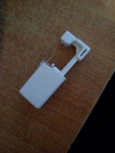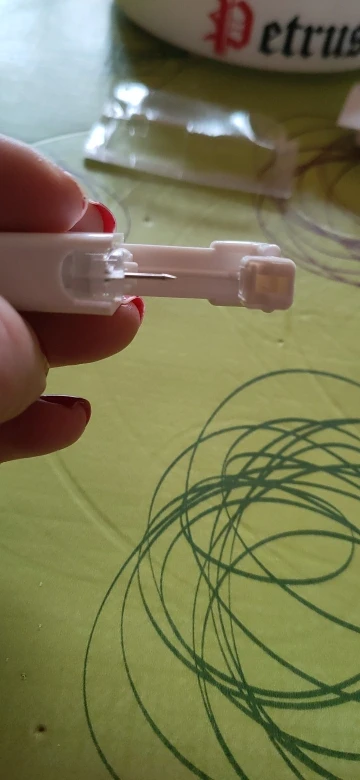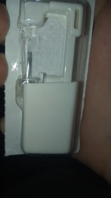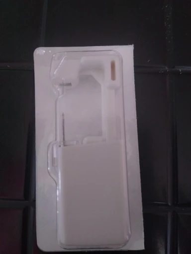 Суперский аппарат. Дошел достаточно быстро и отслеживался. Пробила маме ухо. Сказала, что не больно, но щипало. Этот отличается от синего тем, что белый многоразовый (надо найти острые серьги и вставить) и он не автоматически стреляет. А полностью до конца процесса жмешь сам. Когда себе колола синим, то нажала немного и дальше автоматически сам пробил и закрылся
