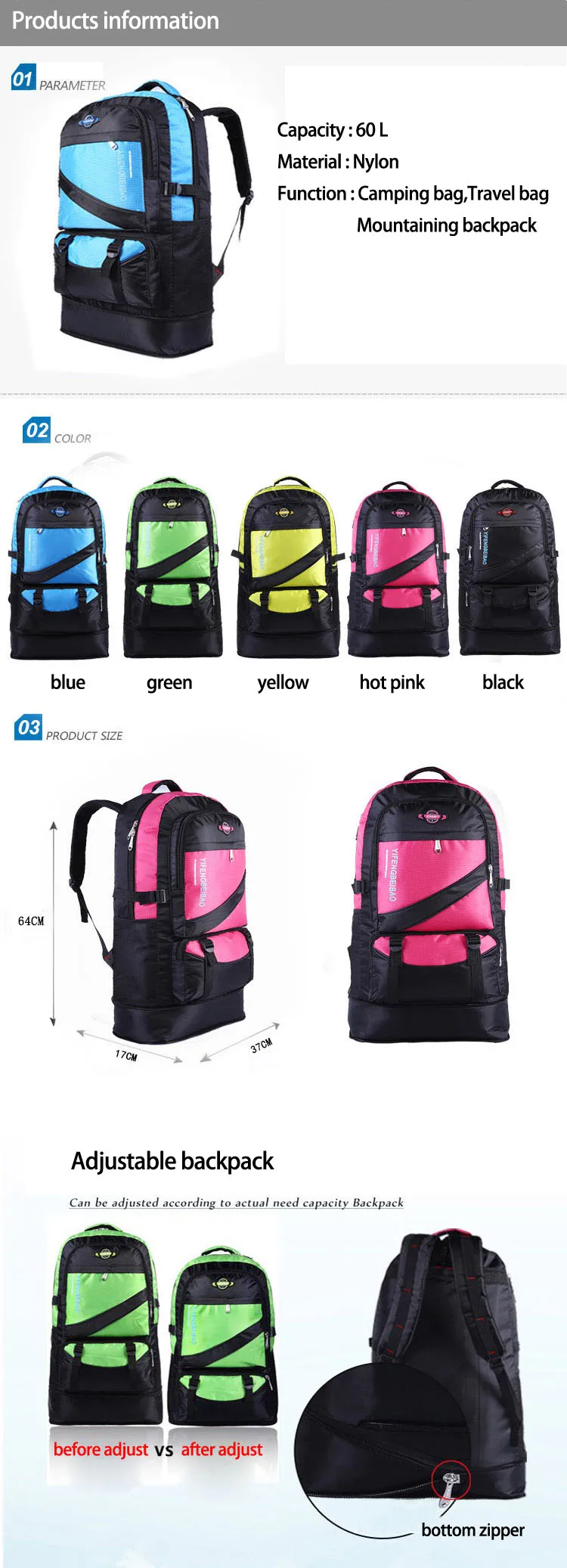 Водонепроницаемый 60L мужской нейлоновый рюкзак, дорожный рюкзак, спортивная сумка для активного отдыха, альпинизма, альпинизма, кемпинга, рюкзак для мужчин