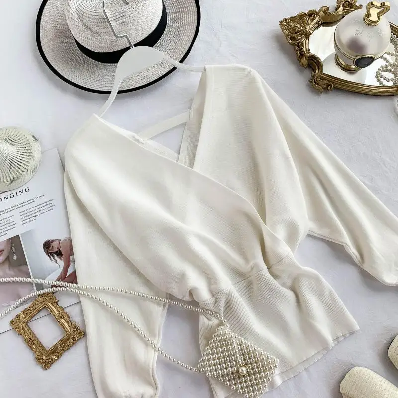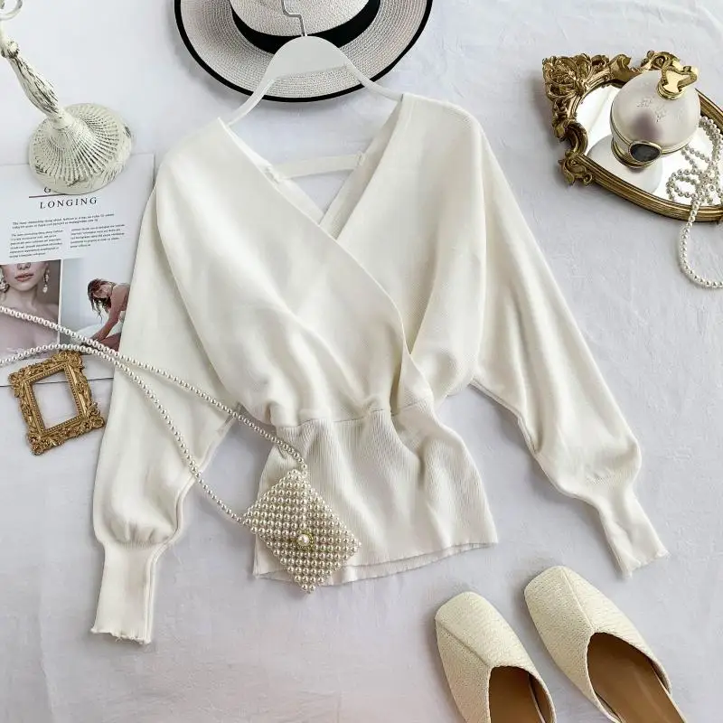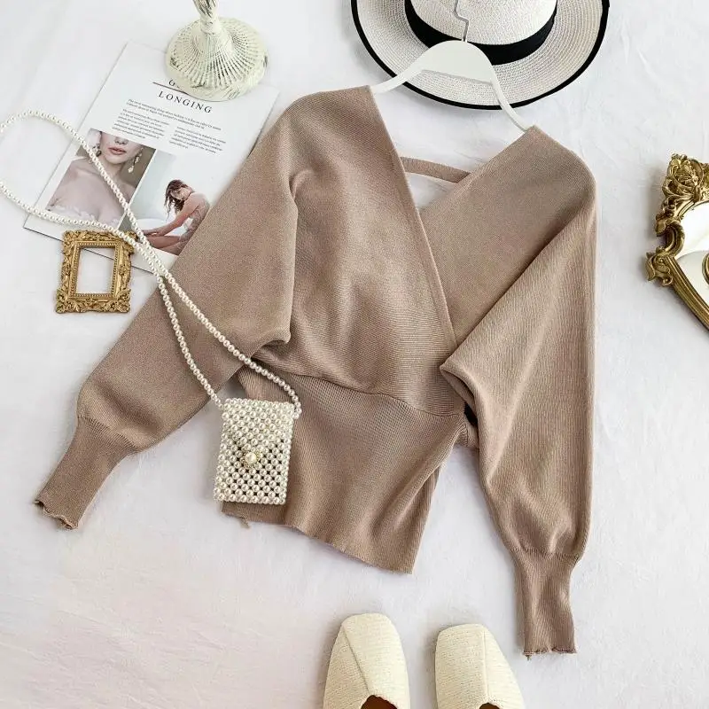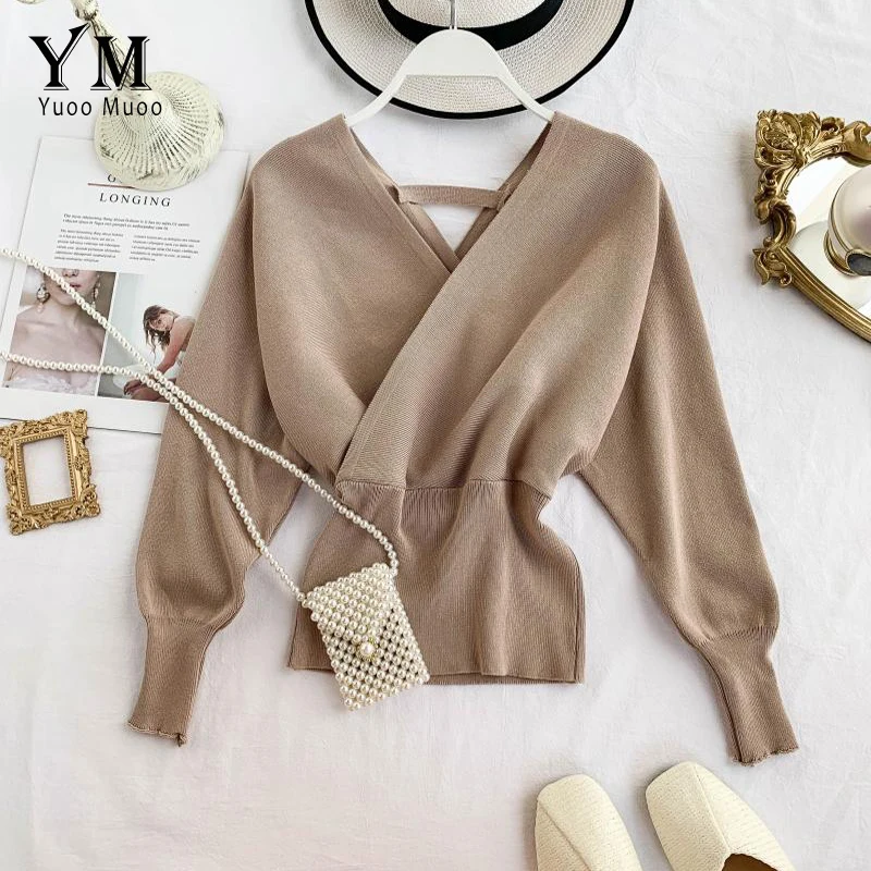Свитер женский трикотажный YuooMuoo, с V-образным вырезом и длинными рукавами летучая мышь