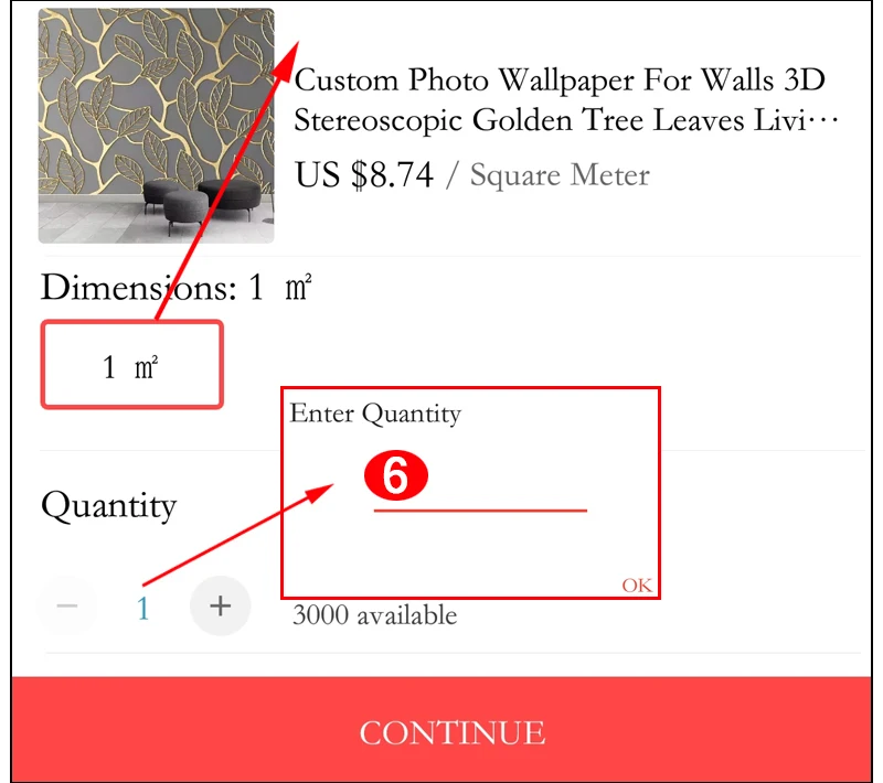 Если вам нужно 6 квадратных метров, пожалуйста, выберите здесь «1 квадратный метр» и «Количество 6».