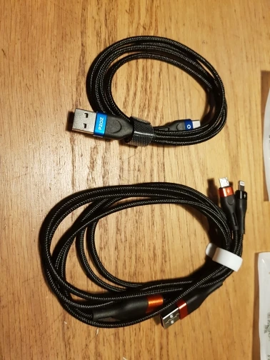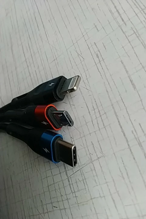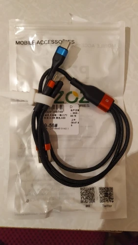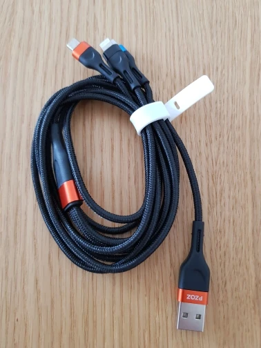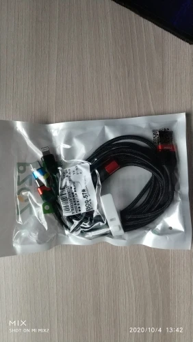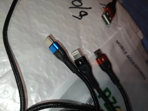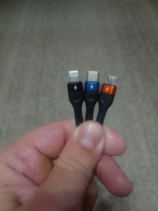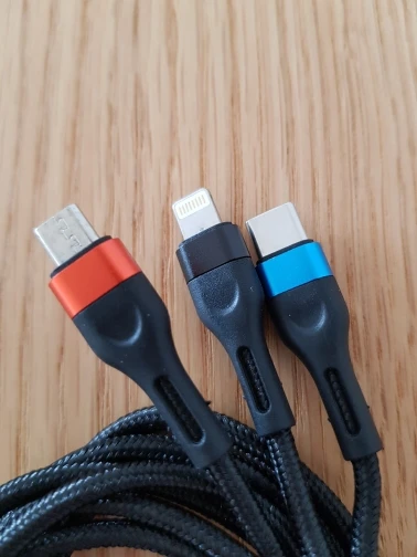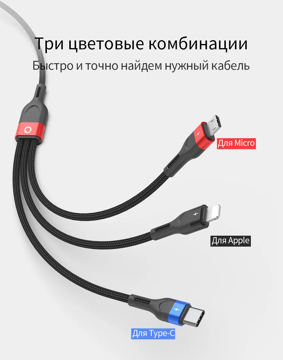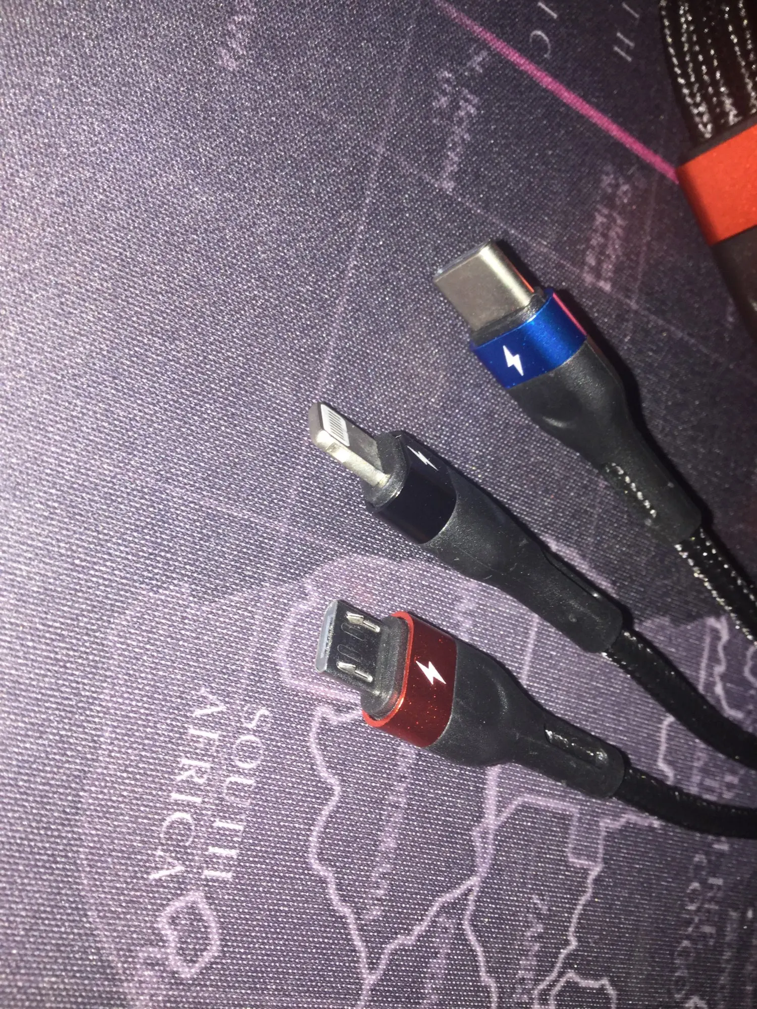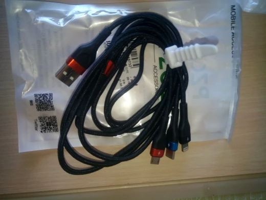 Кабель хороший, мягкий, есть в комплекте хомут силиконовый для провода. Все хвосты работают. Коннектор lightning только для зарядки, данные не передает.