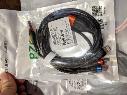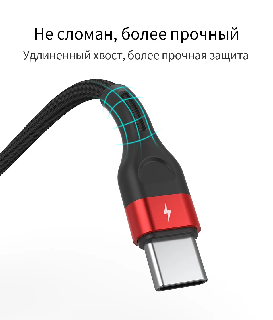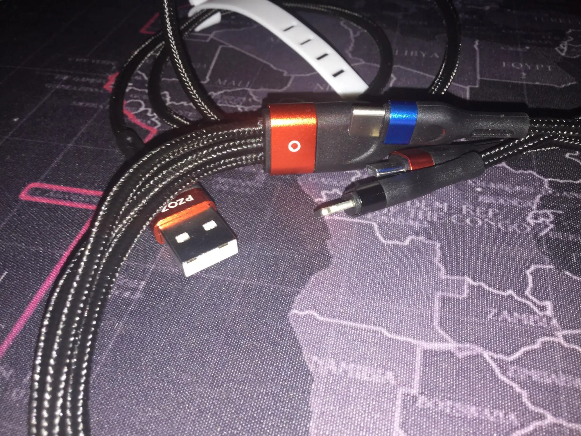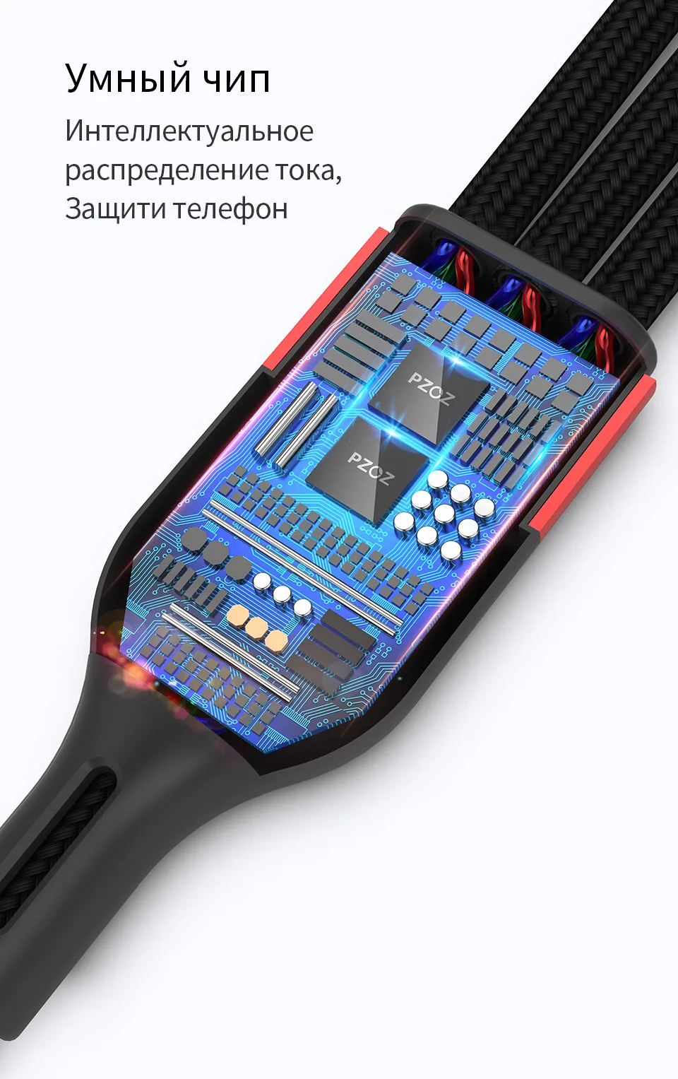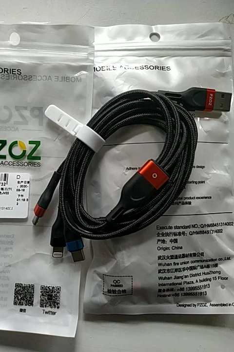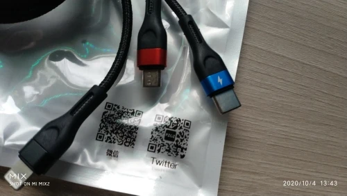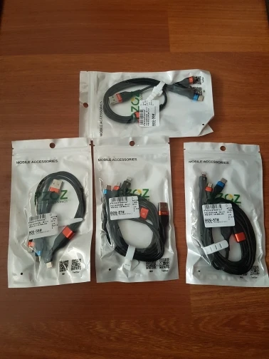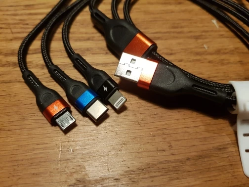 Кабель хороший, мягкий, есть в комплекте хомут силиконовый для провода. Все хвосты работают. Коннектор lightning только для зарядки, данные не передает.