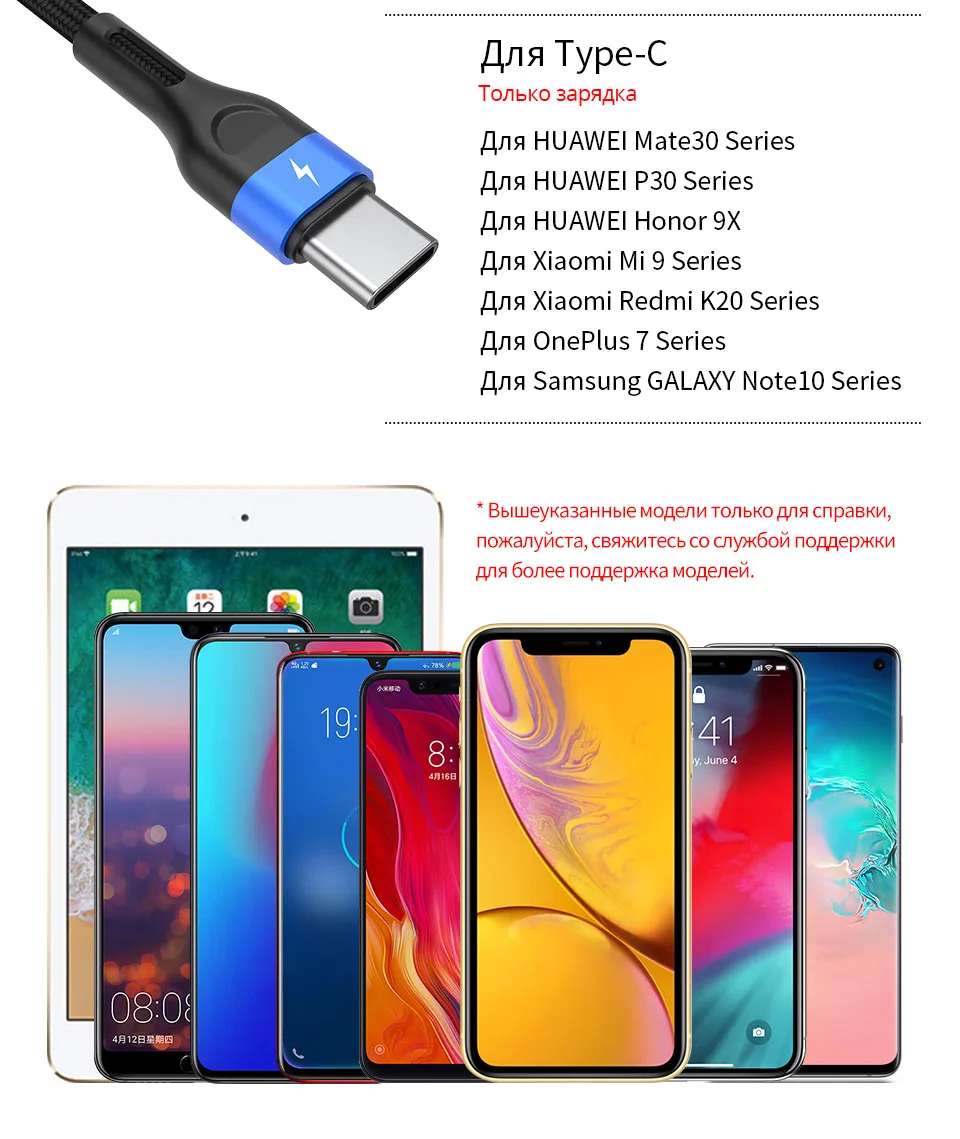 хороший кабель, брал как универсальный в авто, через type-c заряжает, другие разъемы не пробовал, но думаю тоже работаю.