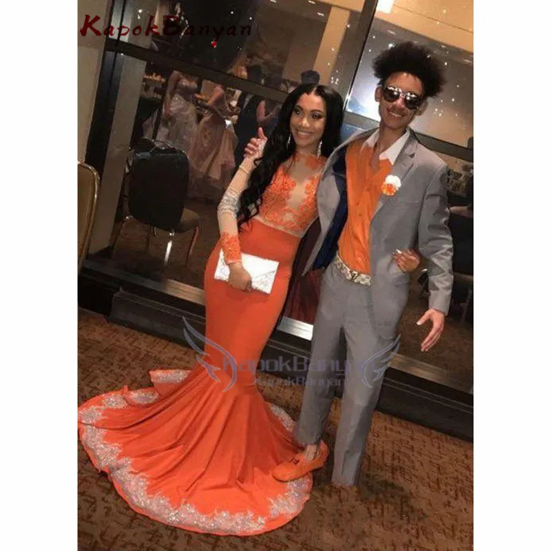 Женское вечернее платье-русалка, оранжевое кружевное платье с длинным рукавом и аппликацией, вечерние шлейфом, для выпускного вечера