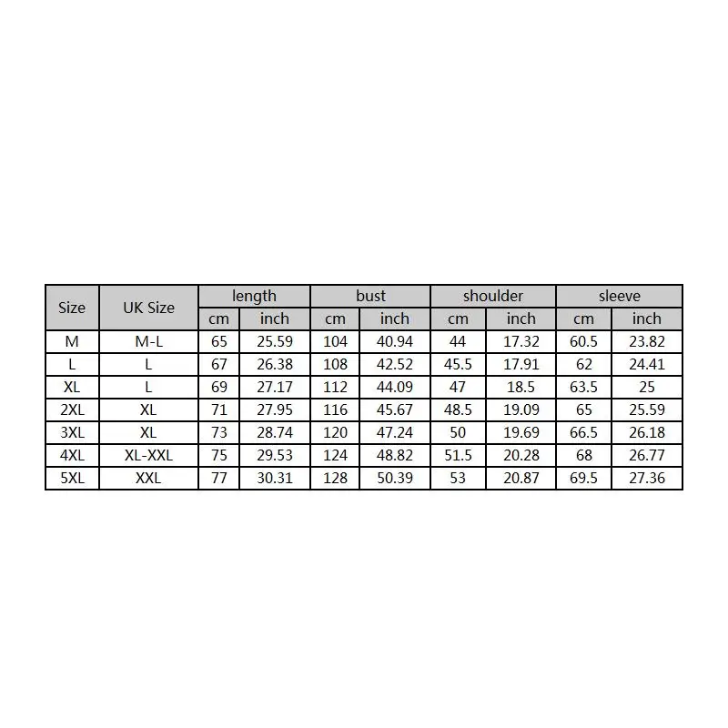 M: ширина плеч: 43,5 см; Обхват груди: 104 см; длина: 64,5 смL: ширина плеч: 45 см; Обхват груди: 108 см; длина: 66,5 смXL: ширина плеч: 46,5 см; Обхват груди: 112 см; длина: 68,5 смXXL: ширина плеч: 48 см; Обхват груди: 116 см; длина: 70,5 см3XL: ширина плеч: 49,5 см; Обхват груди: 120 см; длина: 72,5 см4XL: ширина плеч: 51 см; Обхват груди: 124 см; длина: 74,5 см5XL: ширина плеч: 52,5 см; Обхват груди: 128 см; длина: 76,5 см
