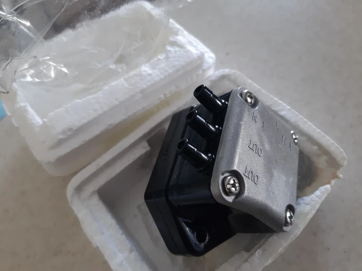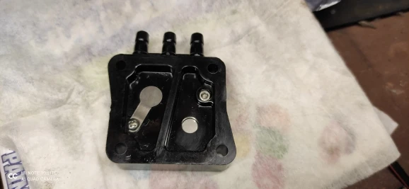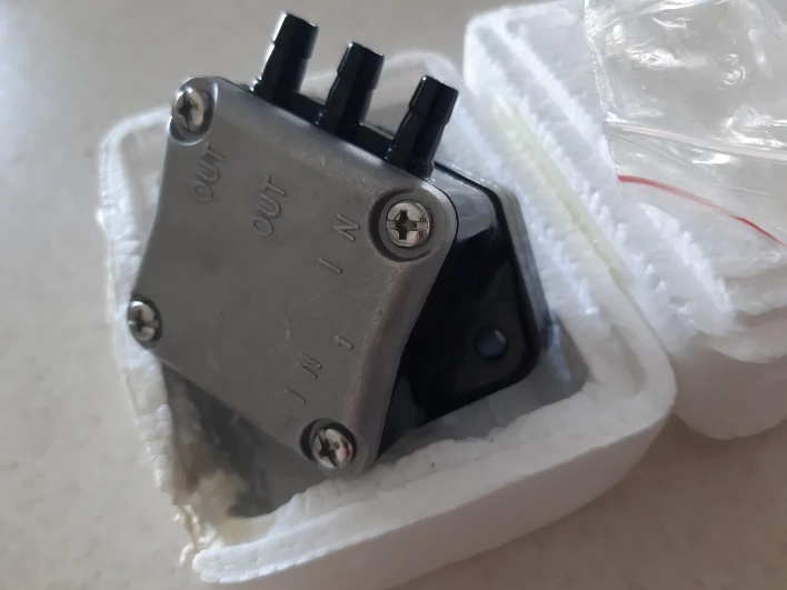 насос пришёл через 10 дней. при вскрытии коробки почувствовал резкий запах бензина, насос был уже использован, так как был наполнен бензином( фото). из двух выходов на карбюраторы просверлено отверстие только у одного ( на фото видно), а также лепестки возможно уже подгибались, видны заломы( фото). в работе не проверял возможно все еще хуже. оценка 2.